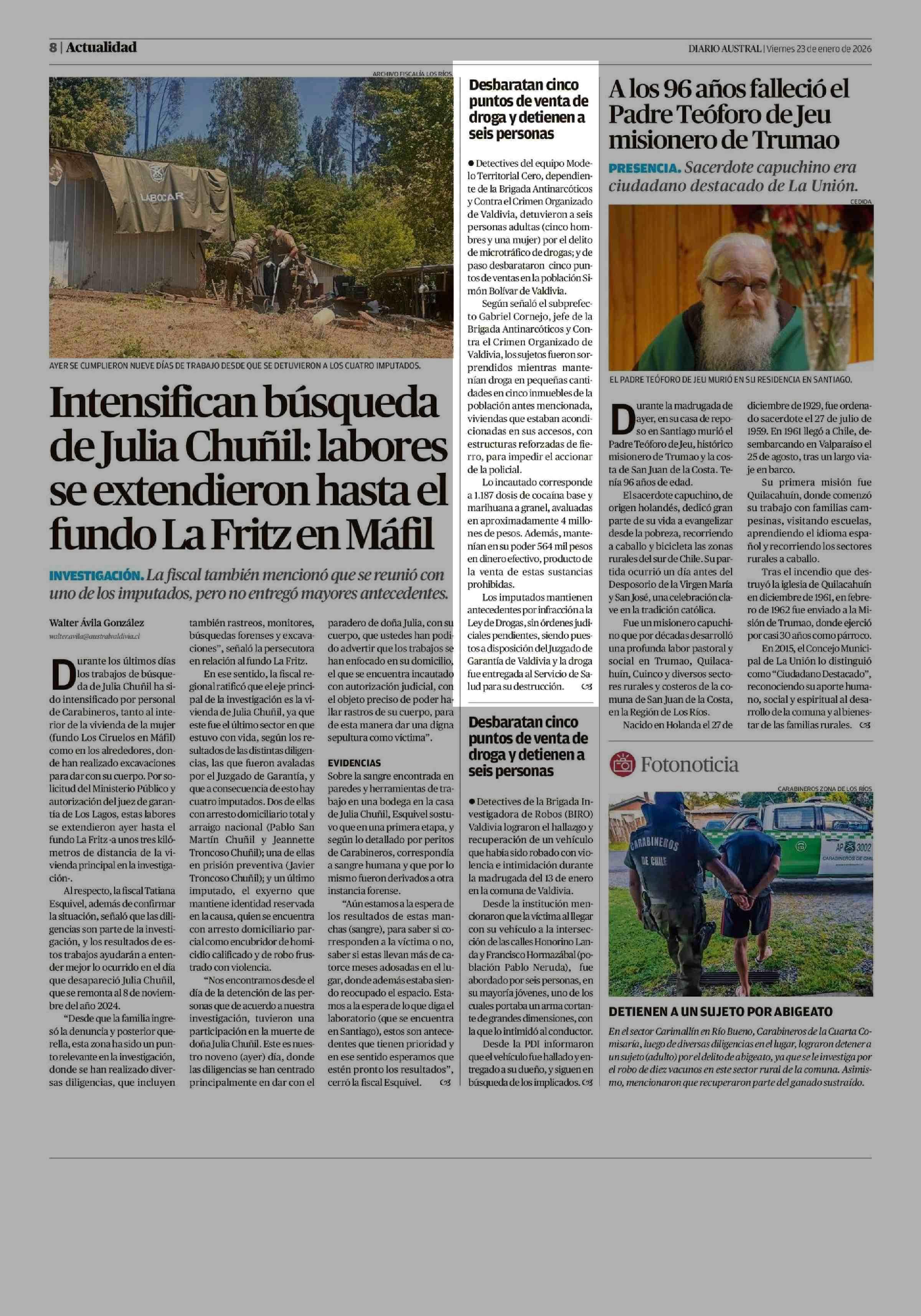 Desbaratan cinco puntos de venta de droga y detienen a seis personas 23-01-2026 Diario Austral Región de Los Ríos |