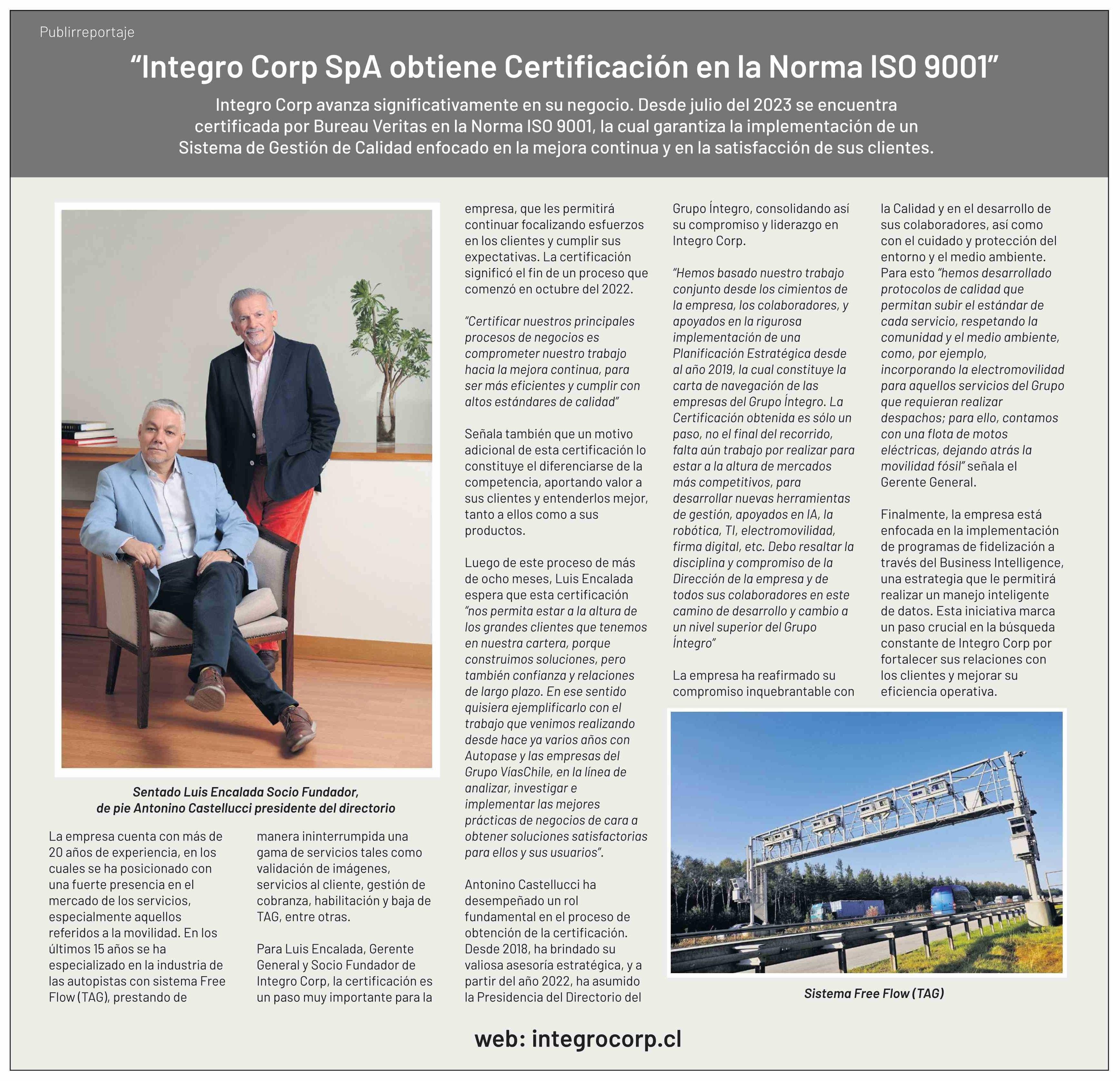 “Integro Corp SpA obtiene Certificación en la Norma ISO 9001" 04-09-2023 El Mercurio |