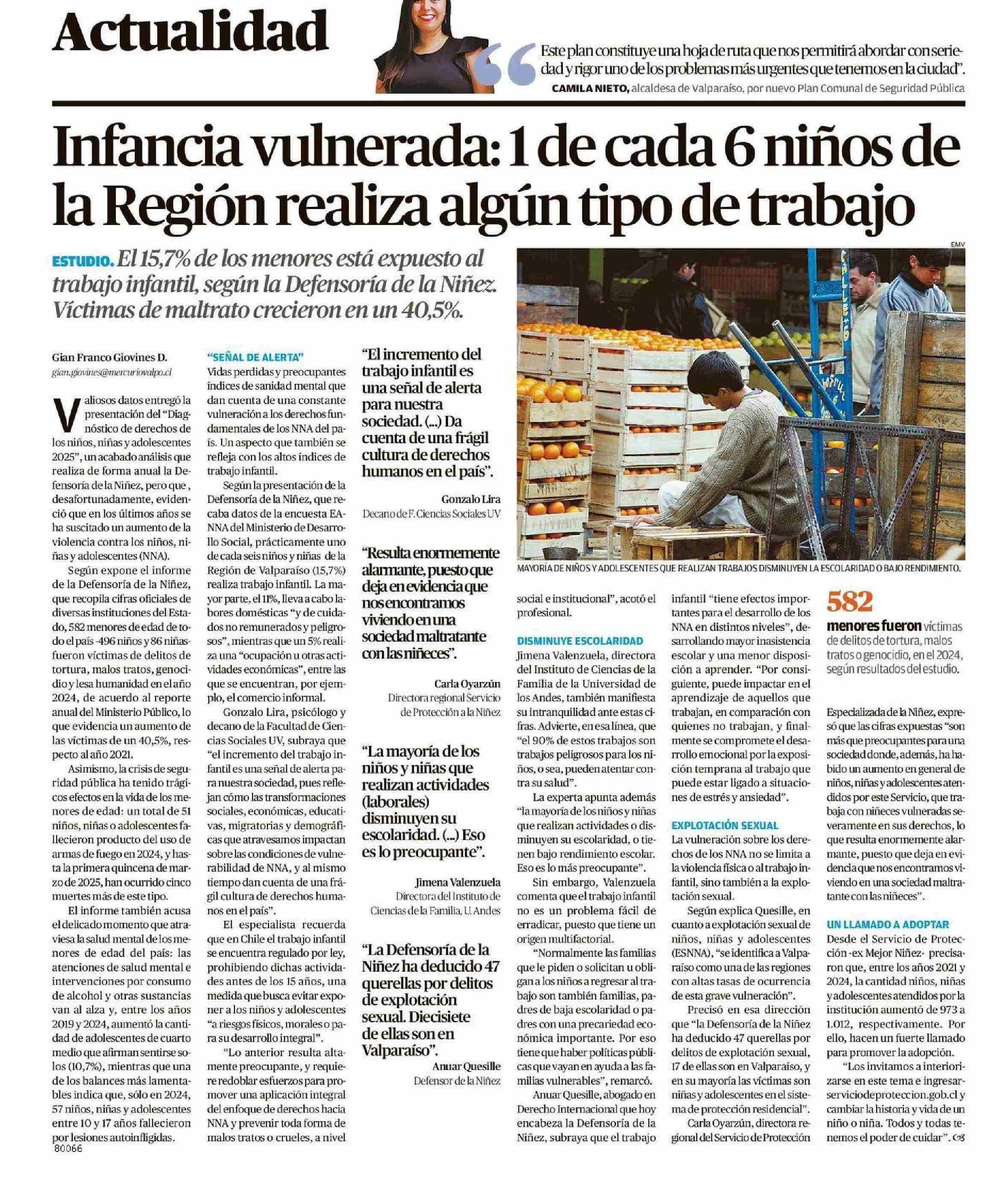 Infancia vulnerada: 1 de cada 6 niños de la Región realiza algún tipo de trabajo 18-04-2025 El Mercurio de Valparaíso |
