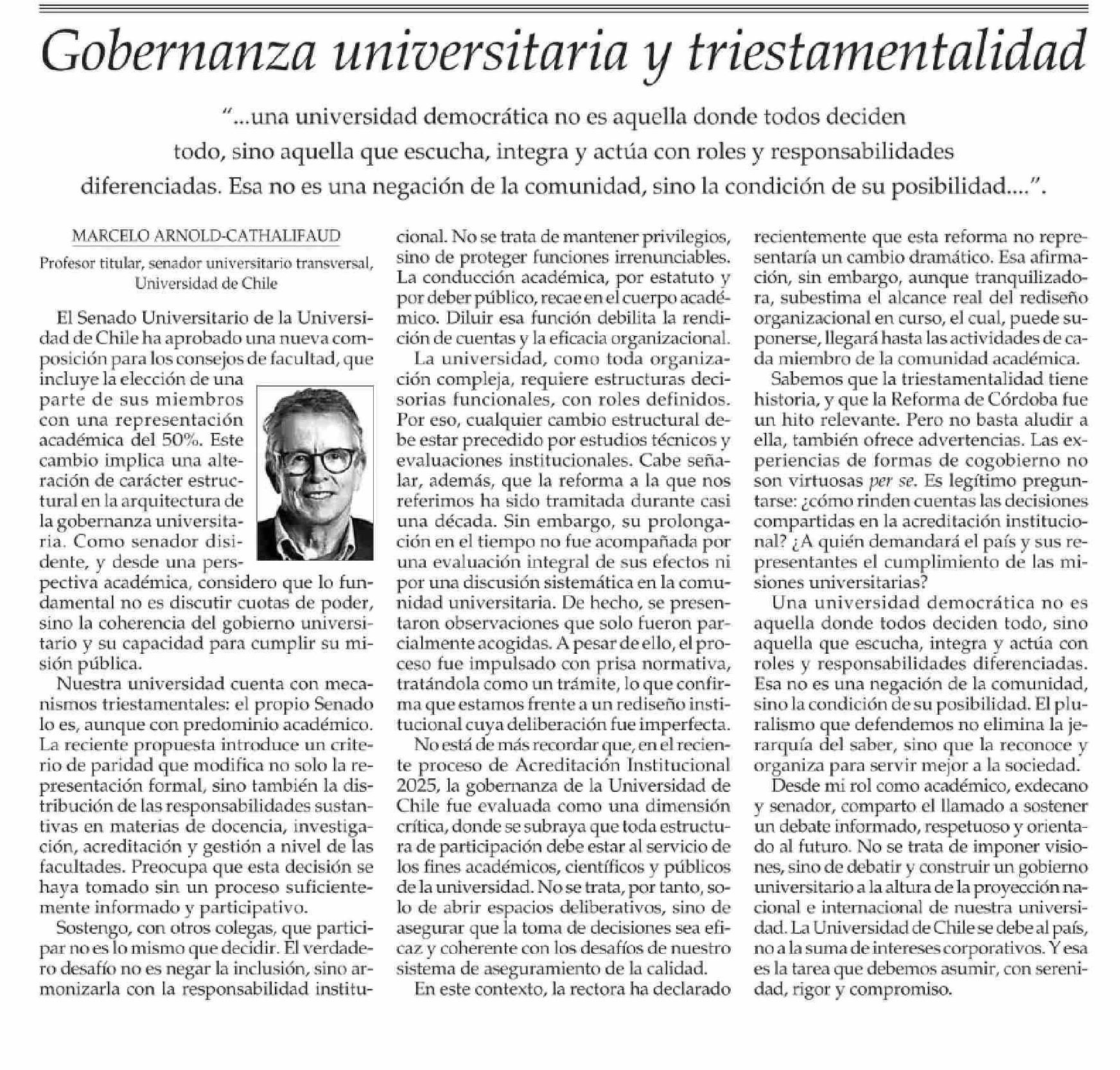 COLUMNAS DE OPINIÓN: Gobernanza universitaria y triestamentalidad 04-06-2025 El Mercurio |