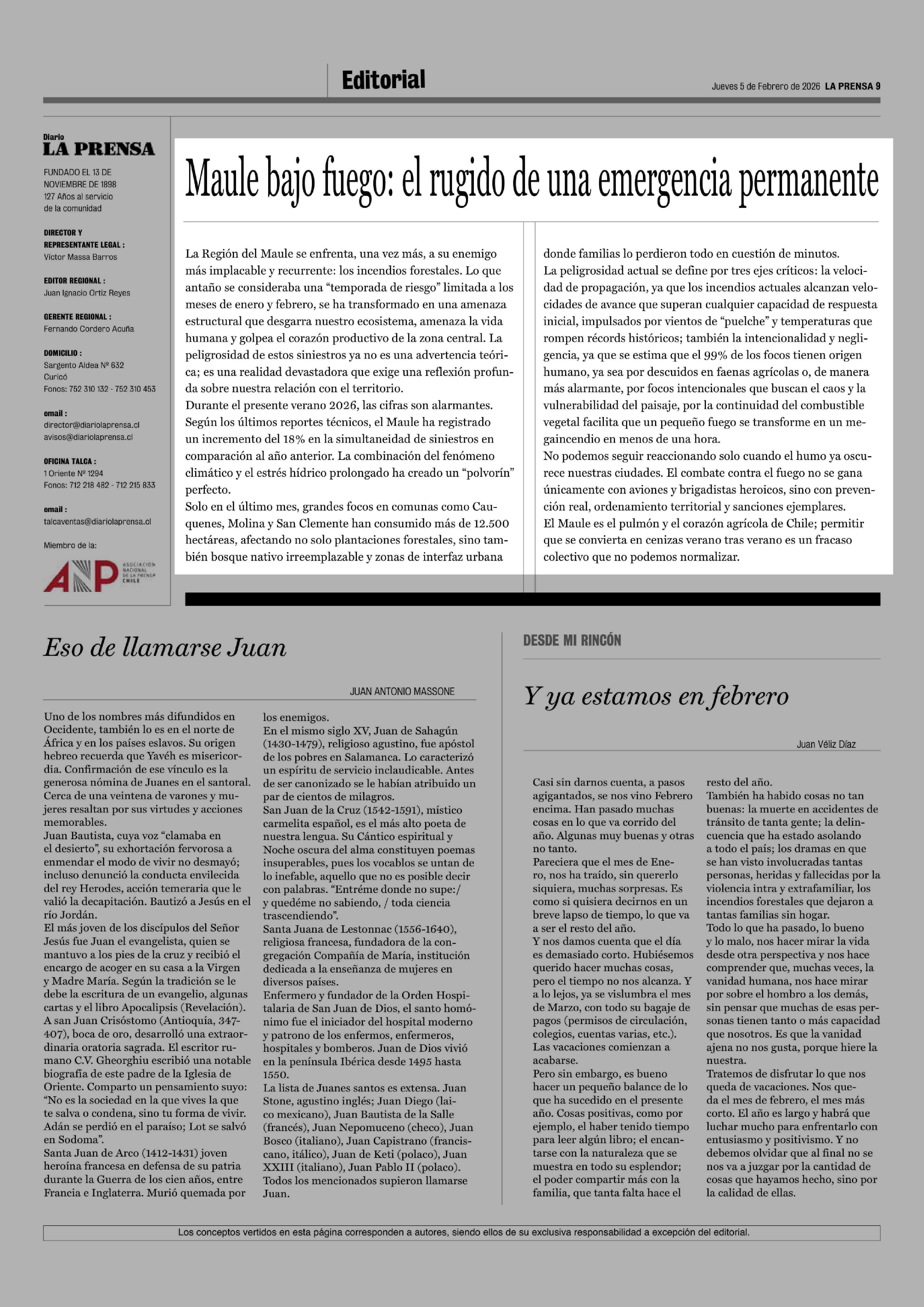 Editorial: Maule bajo fuego: el rugido de una emergencia permanente 05-02-2026 La Prensa de Curicó |