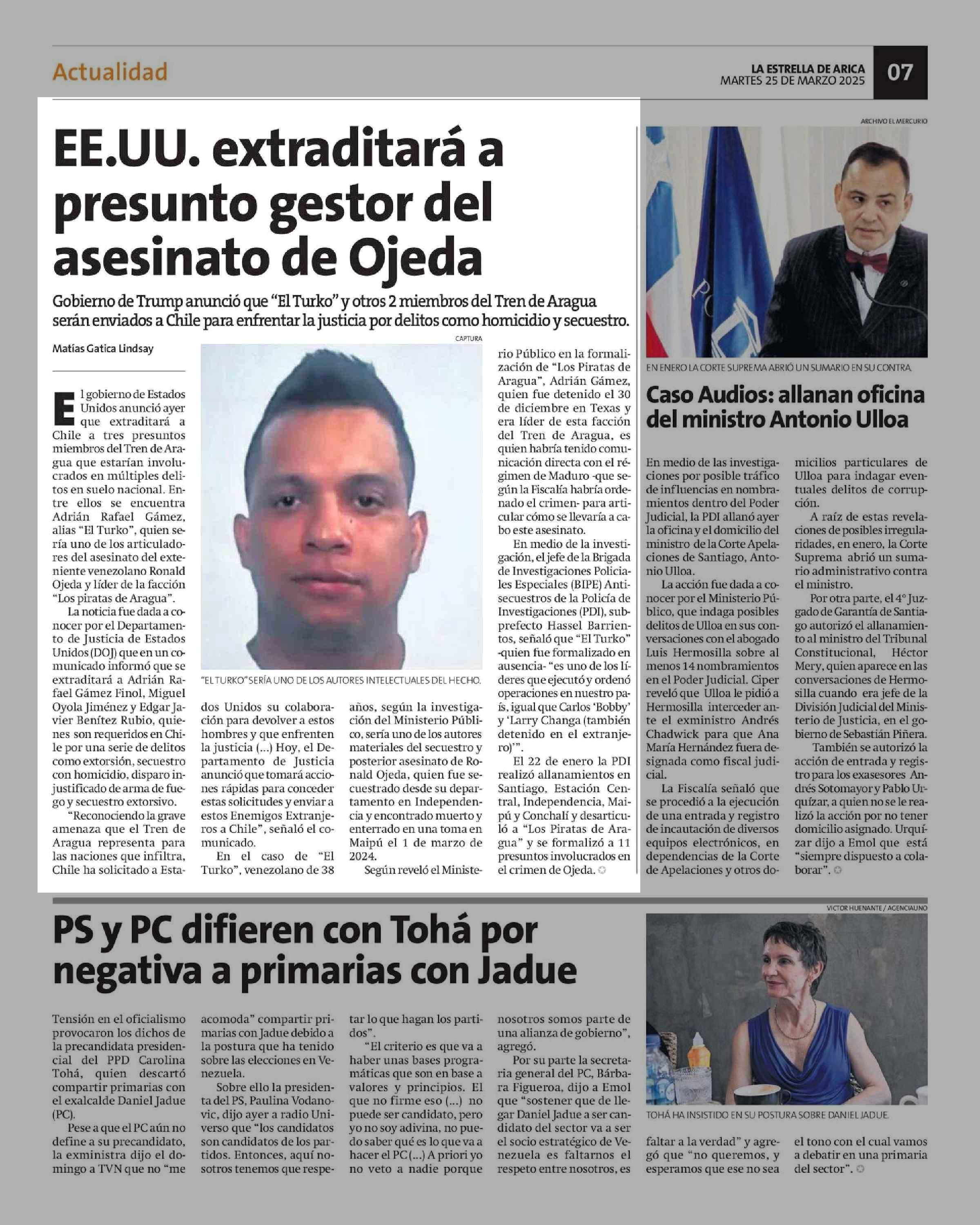EE.UU. extraditará a presunto gestor del asesinato de Ojeda 25-03-2025 La Estrella de Arica |