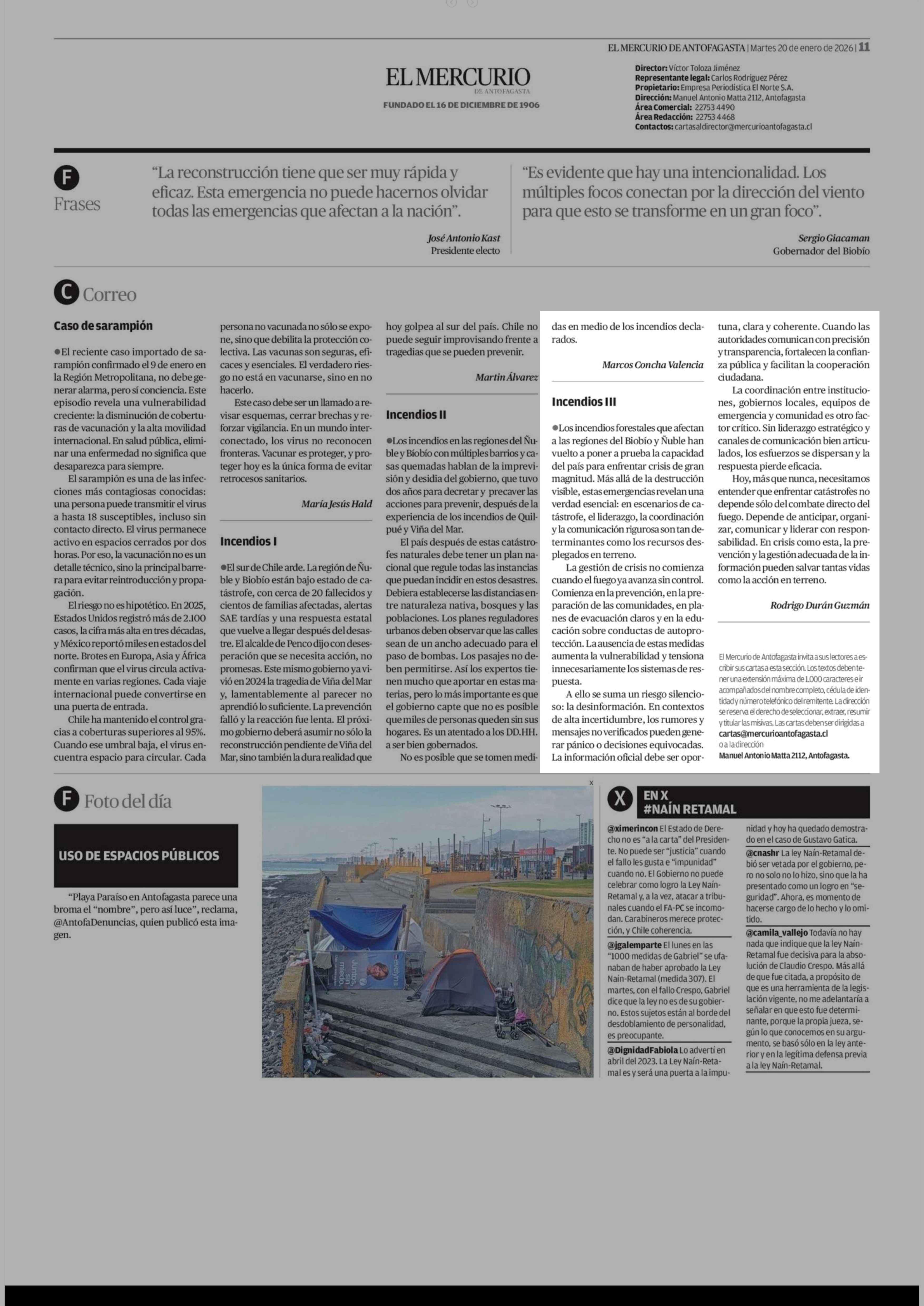 Cartas: Incendios III 20-01-2026 El Mercurio de Antofagasta |