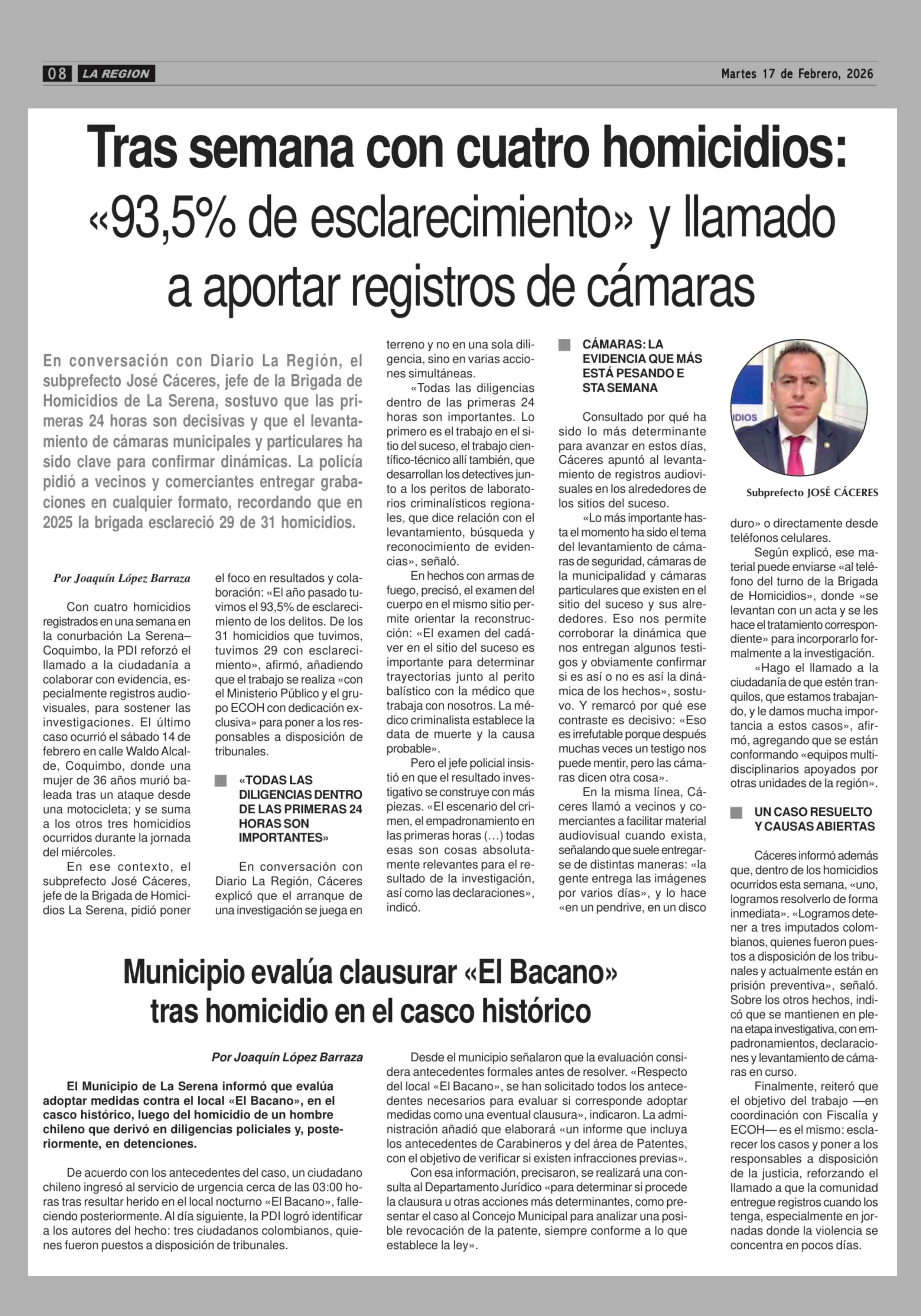 Tras semana con cuatro homicidios: «93,5% de esclarecimiento» y llamado a aportar registros de cámaras 17-02-2026 Diario la Región |
