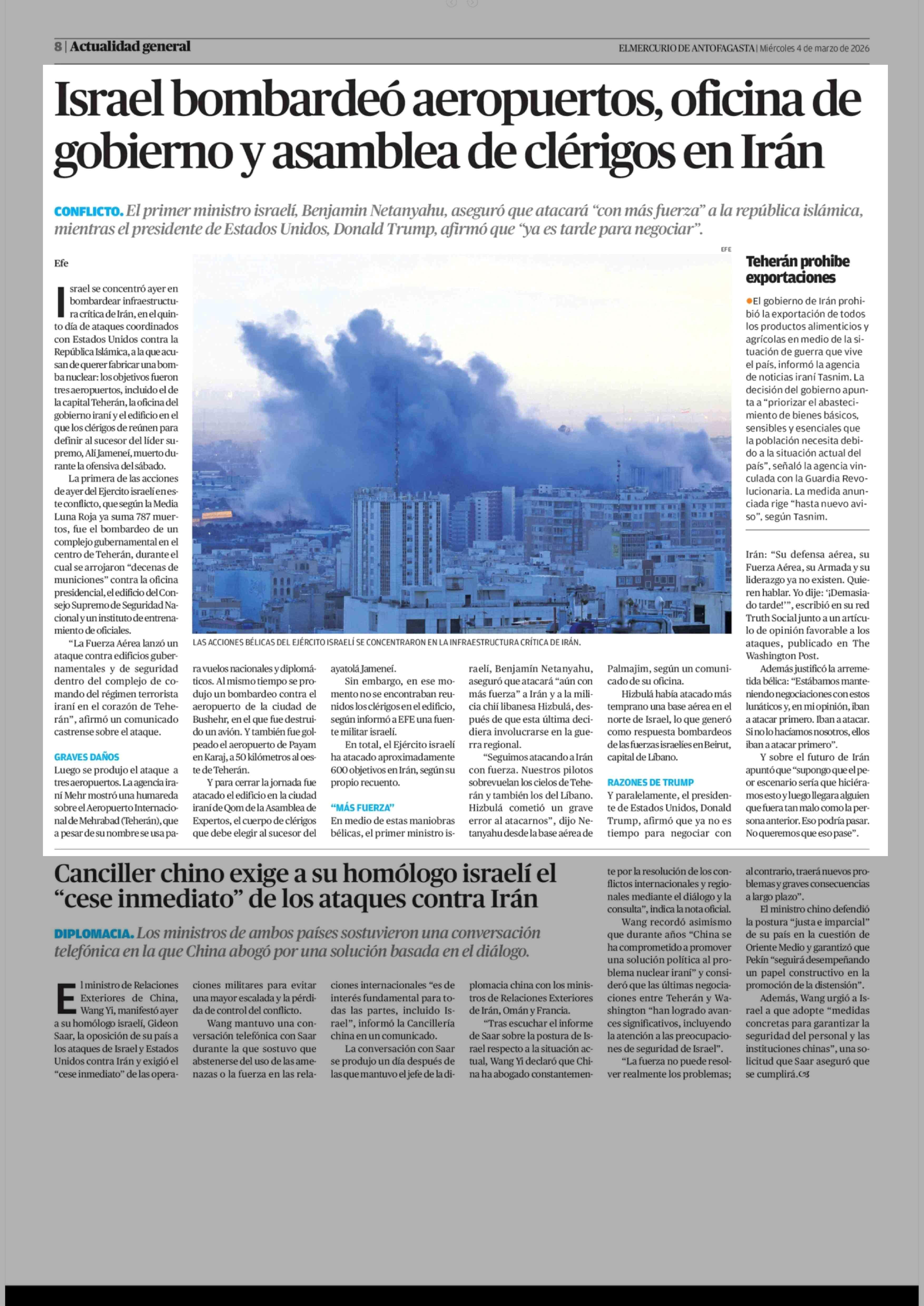 Israel bombardeó aeropuertos, oficina de gobierno y asamblea de clérigos en Irán 04-03-2026 El Mercurio de Antofagasta |