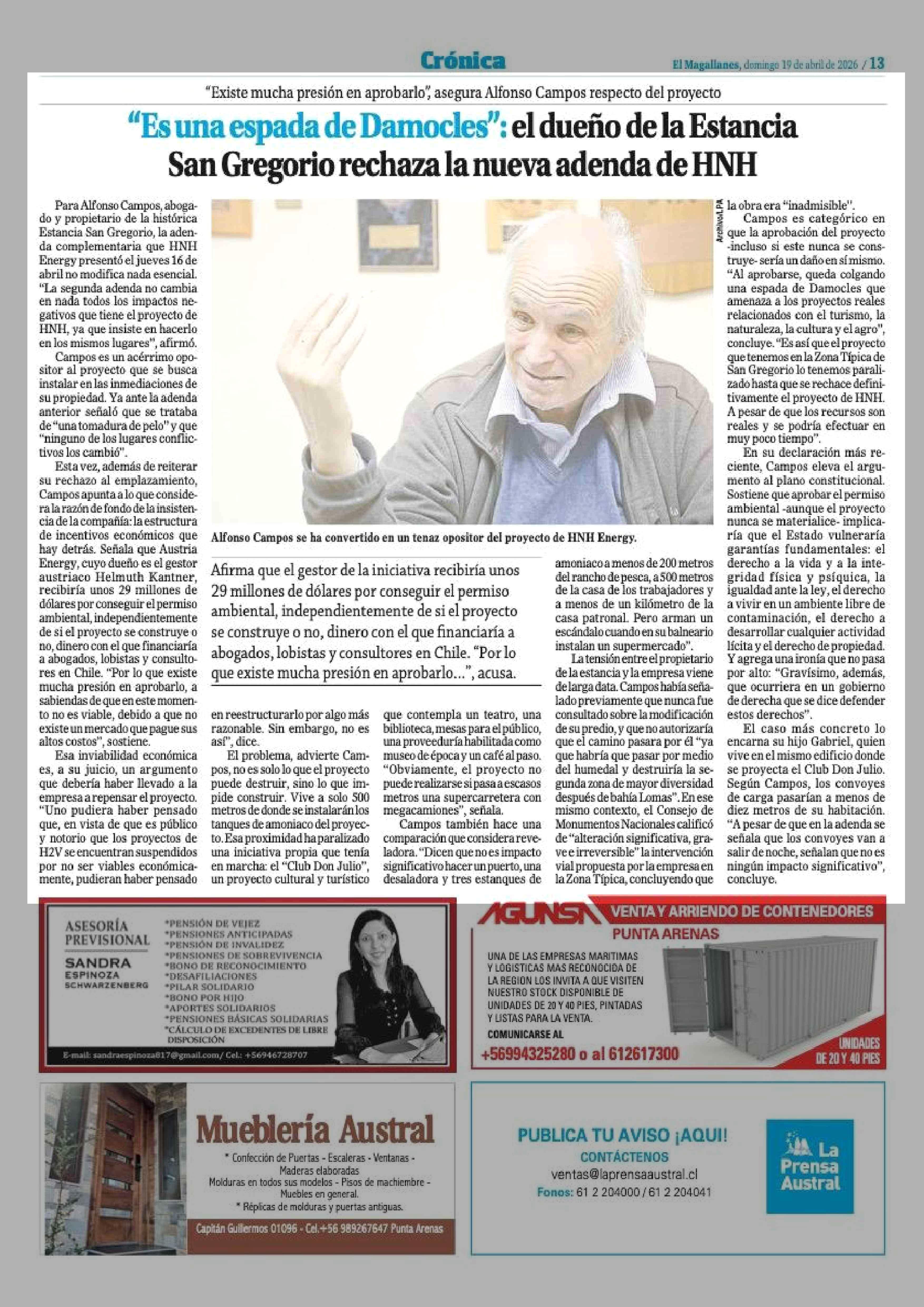 "Es una espada de Damocles": el dueño de la Estancia San Gregorio rechaza la nueva adenda de HNH 19-04-2026 El Magallanes |