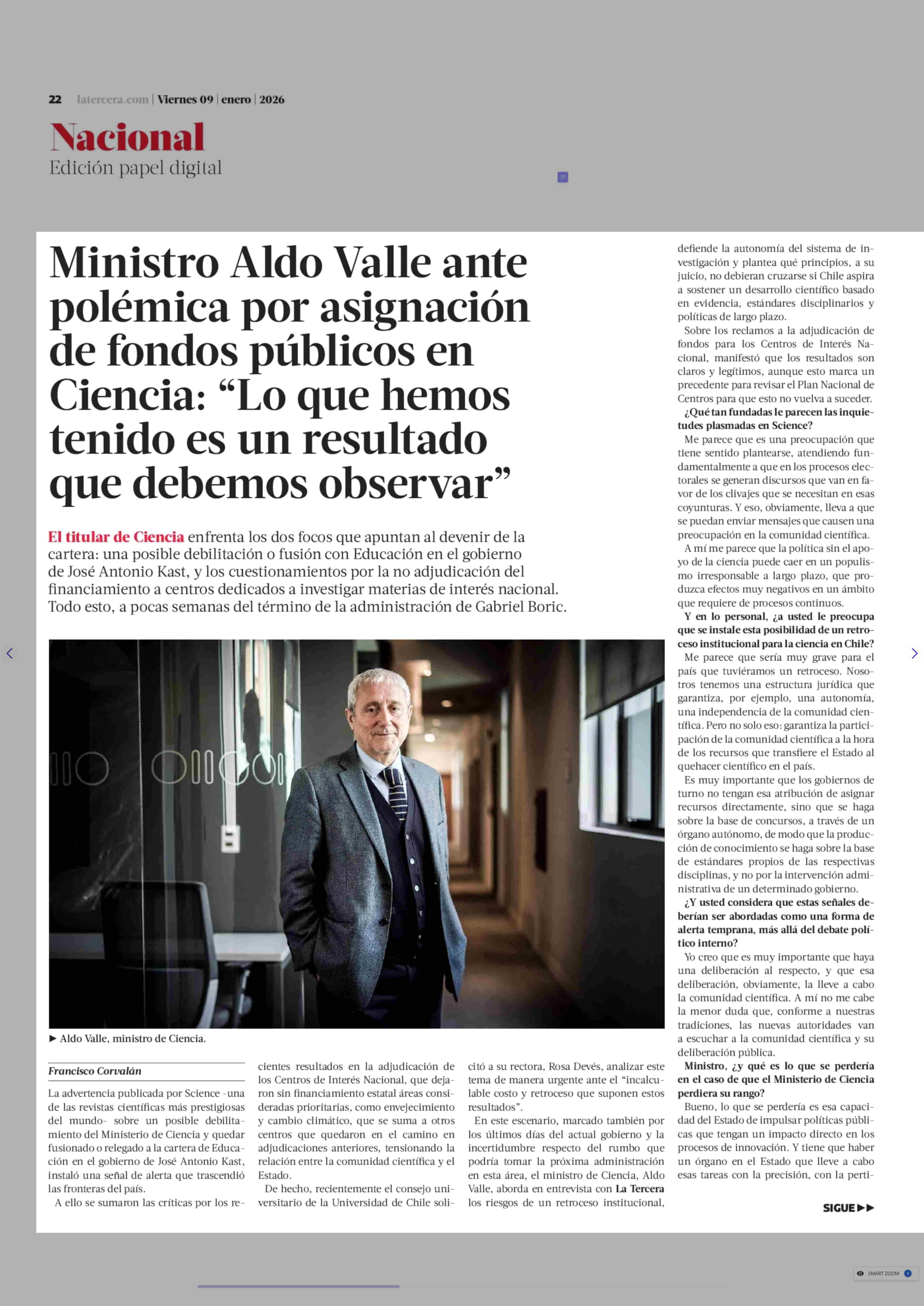 Título: Ministro Aldo Valle ante polémica por asignación de fondos públicos en Ciencia: "Lo que hemos tenido es un resultado que debemos observar"