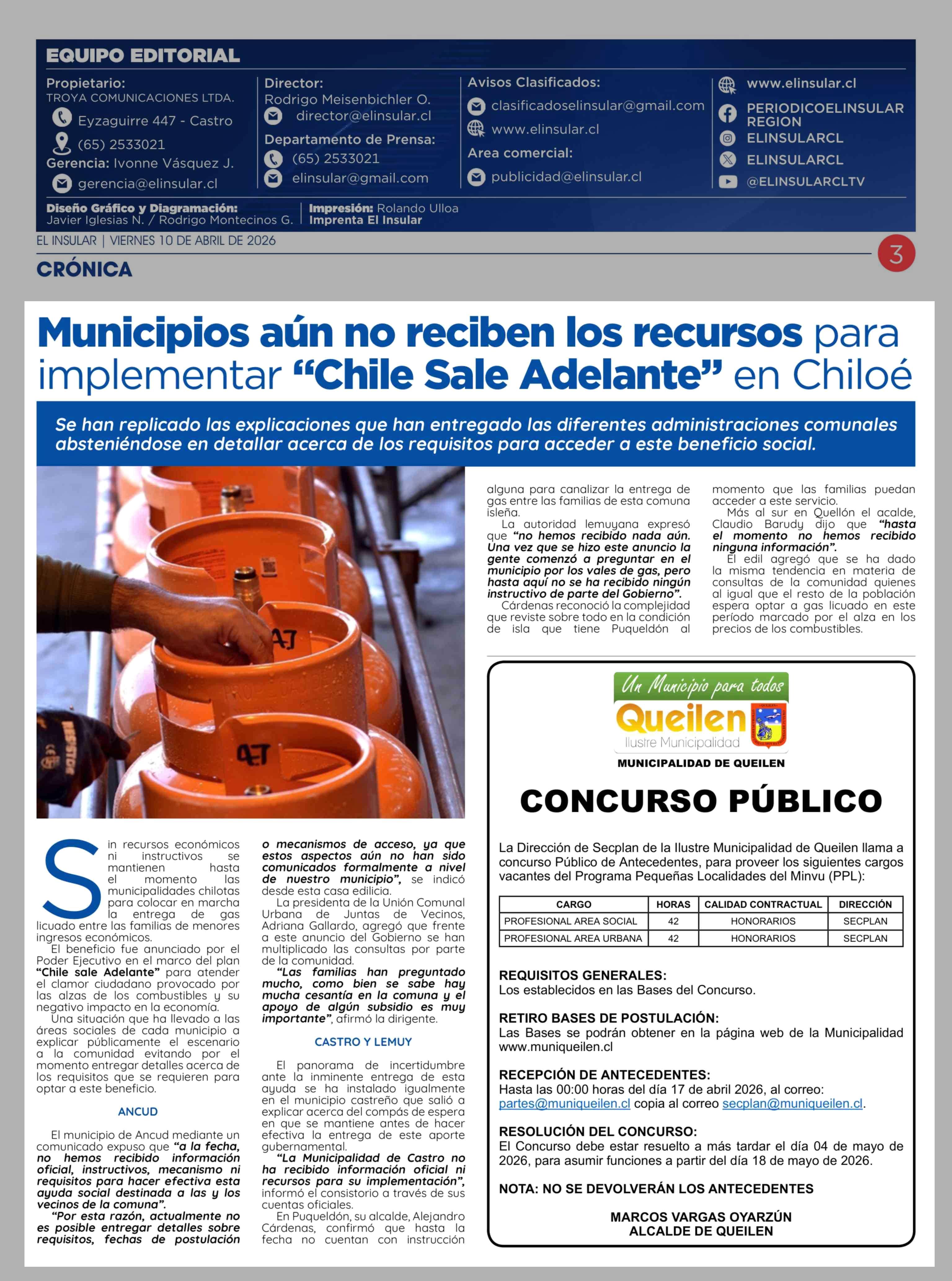 Municipios aún no reciben los recursos para implementar "Chile Sale Adelante" en Chiloé 10-04-2026 El Insular |