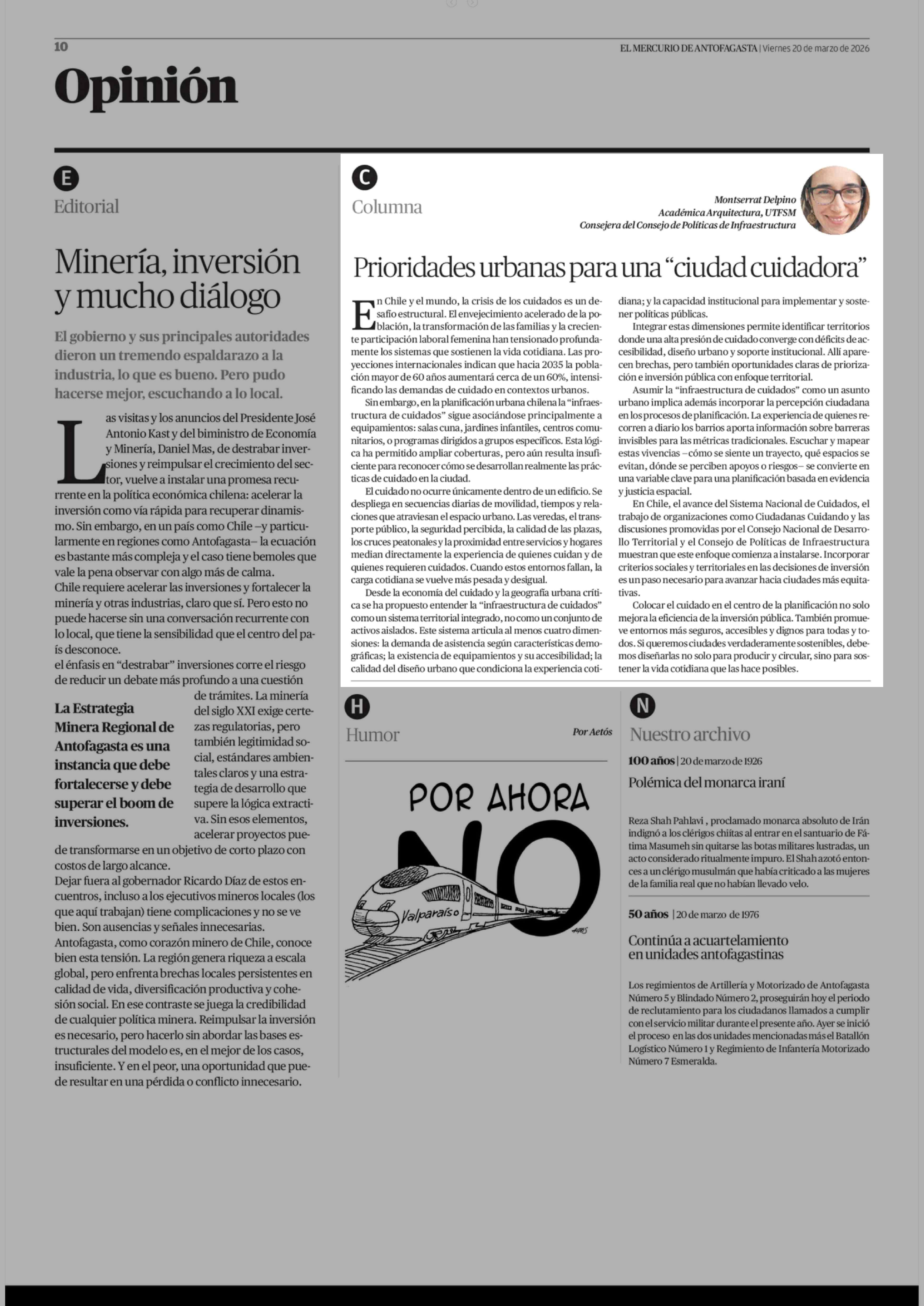 Columnas de Opinión: Prioridades urbanas para una "ciudad cuidadora" 20-03-2026 El Mercurio de Antofagasta |