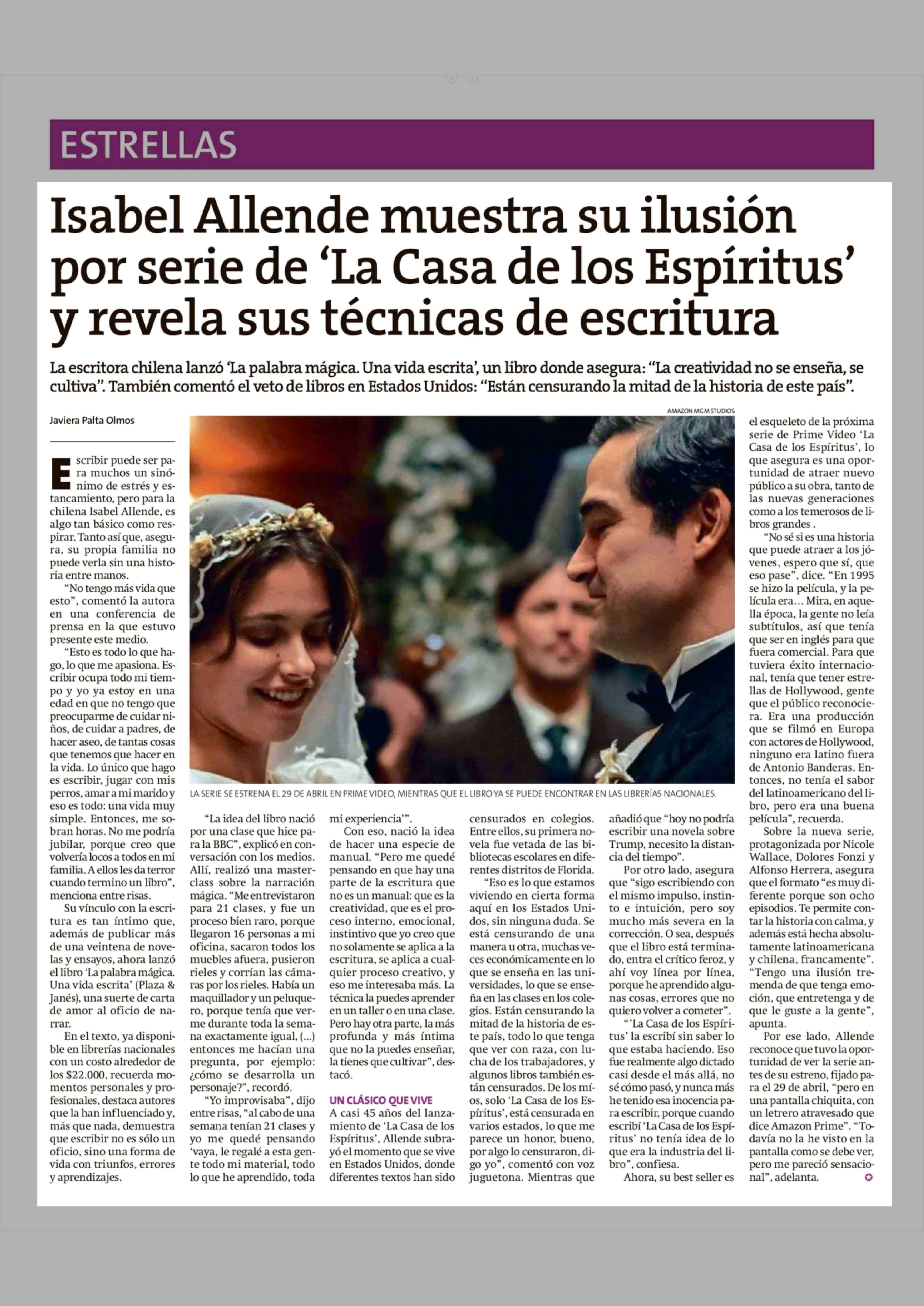 | Título: | Isabel Allende muestra su ilusión por serie de 'La Casa de los Espíritus' y revela sus técnicas de escritura |