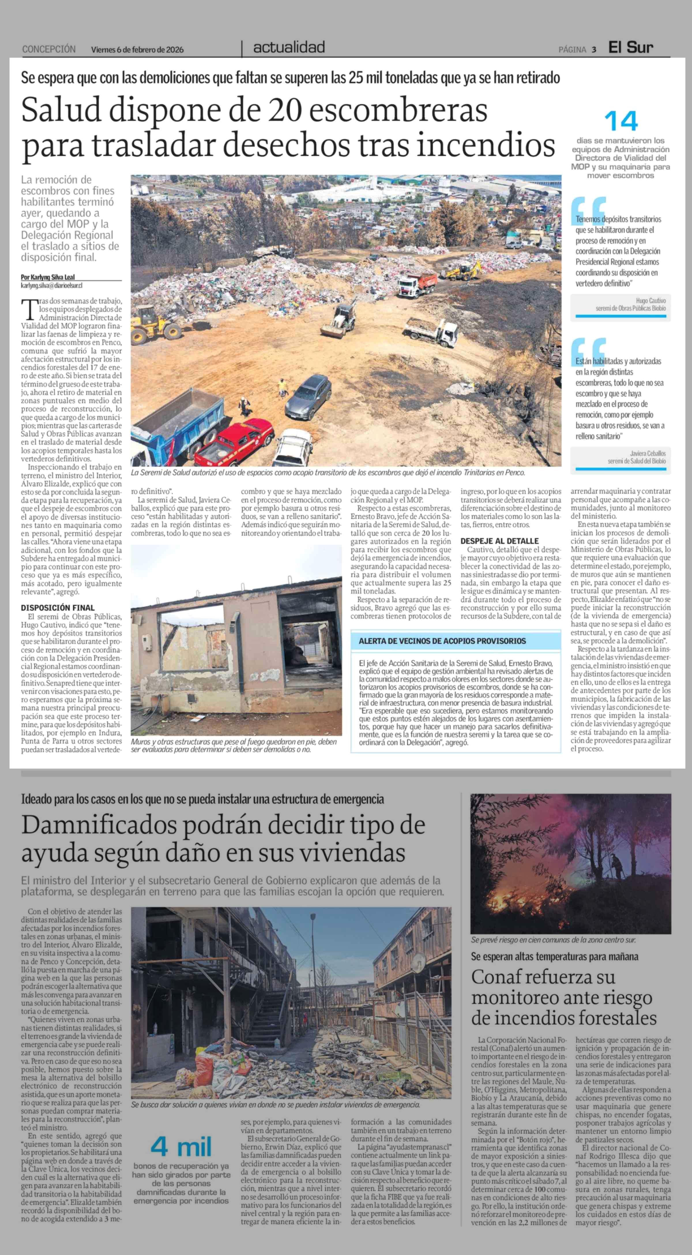 Salud dispone de 20 escombreras para trasladar desechos tras incendios 06-02-2026 El Sur |