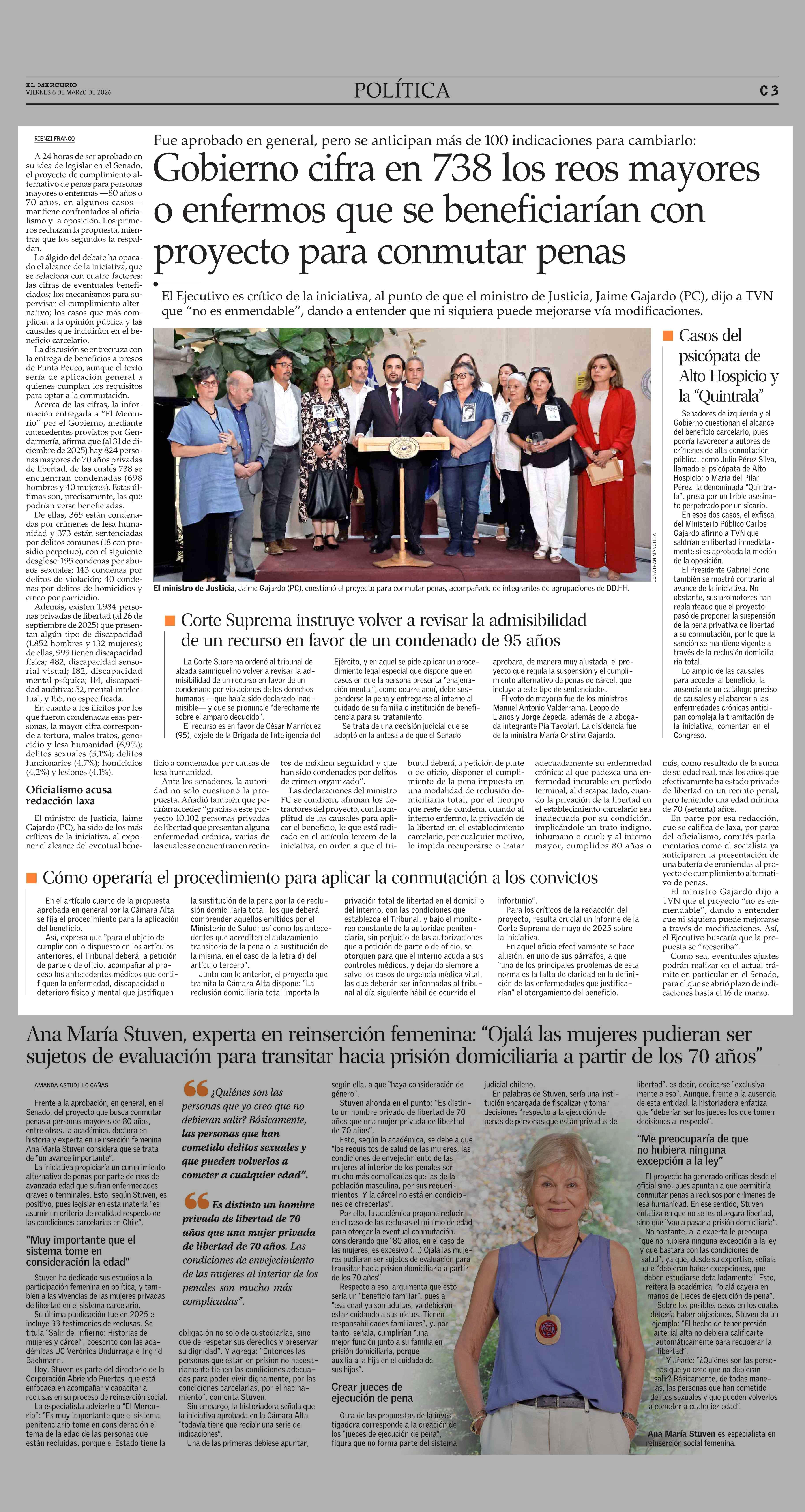 Gobierno cifra en 738 los reos mayores o enfermos que se beneficiarían con proyecto para conmutar penas 06-03-2026 El Mercurio |
