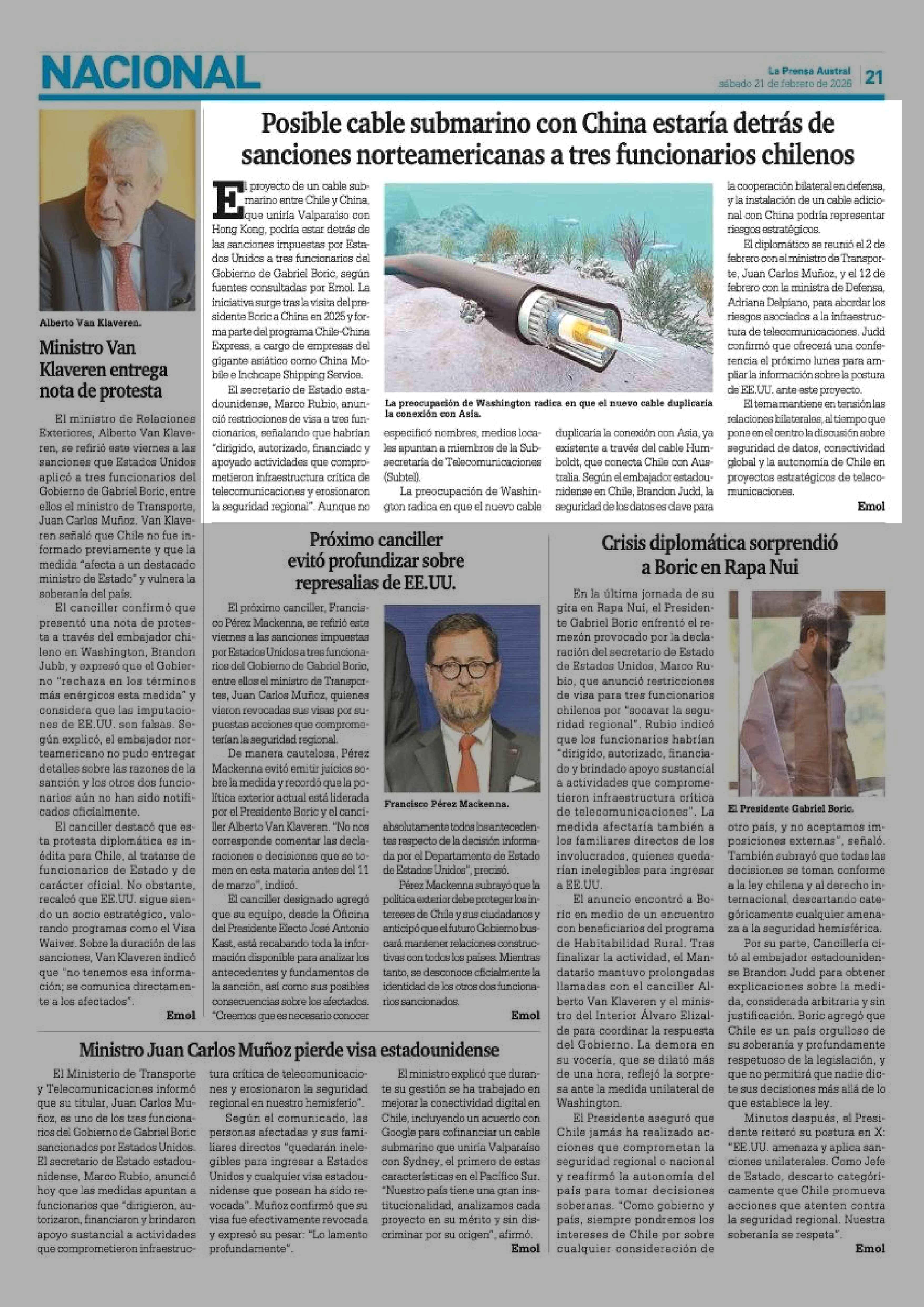 Título: Posible cable submarino con China estaría detrás de sanciones norteamericanas a tres funcionarios chilenos
