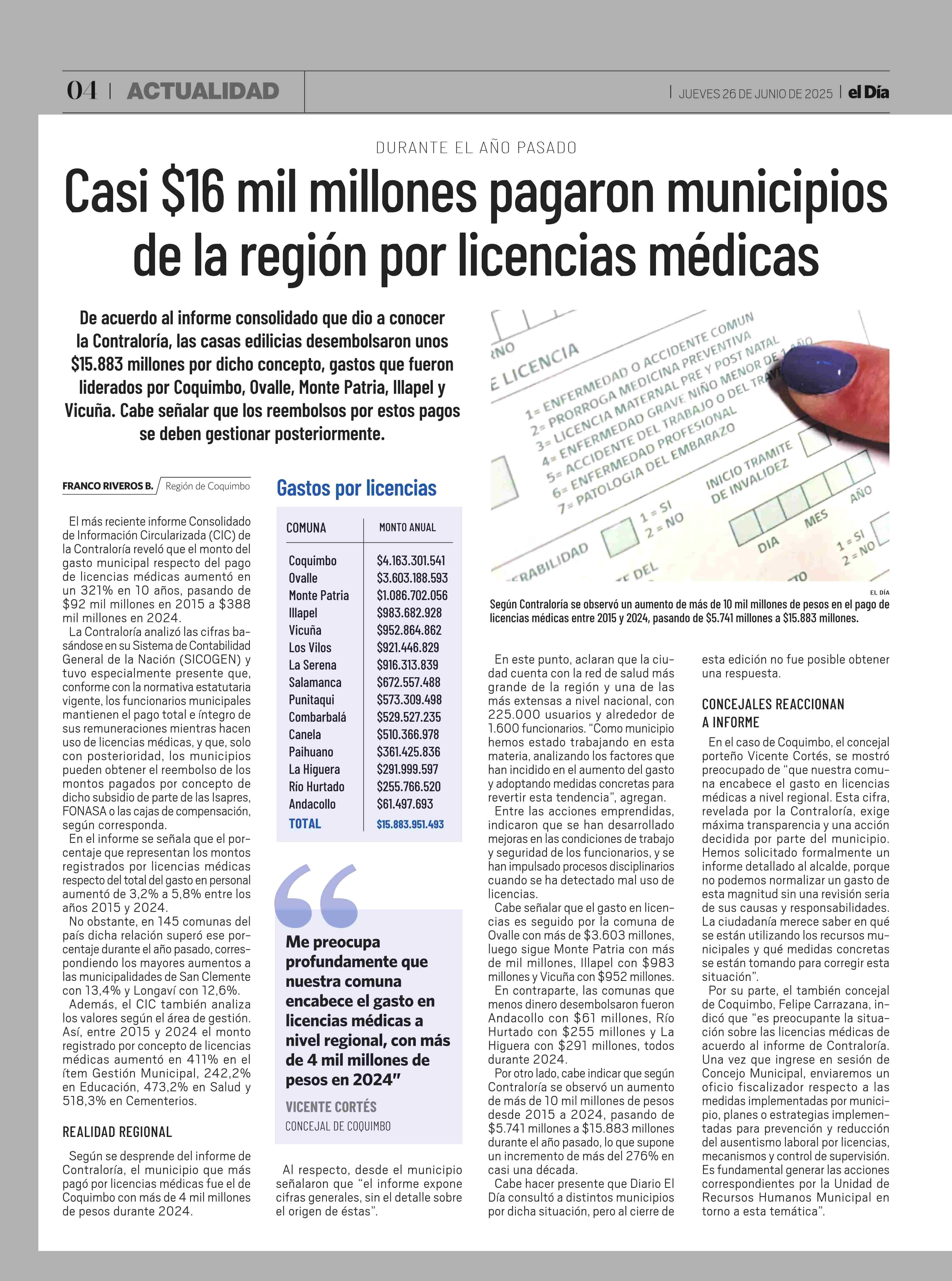 Casi $16 mil millones pagaron municipios de la región por licencias médicas 26-06-2025 El Día |