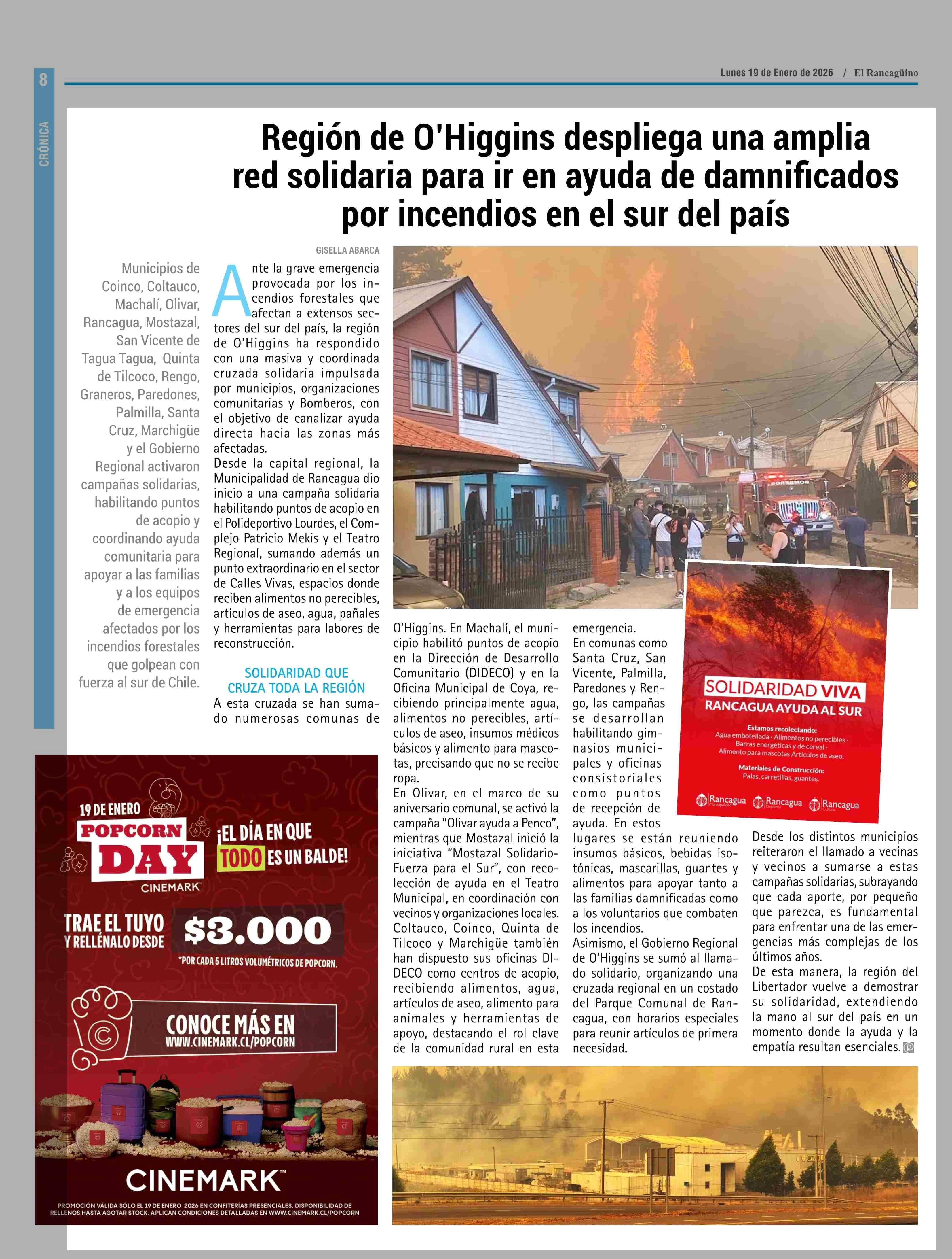 Región de O'Higgins despliega una amplia red solidaria para ir en ayuda de damnificados por incendios en el sur del país 19-01-2026 El Rancagüino |
