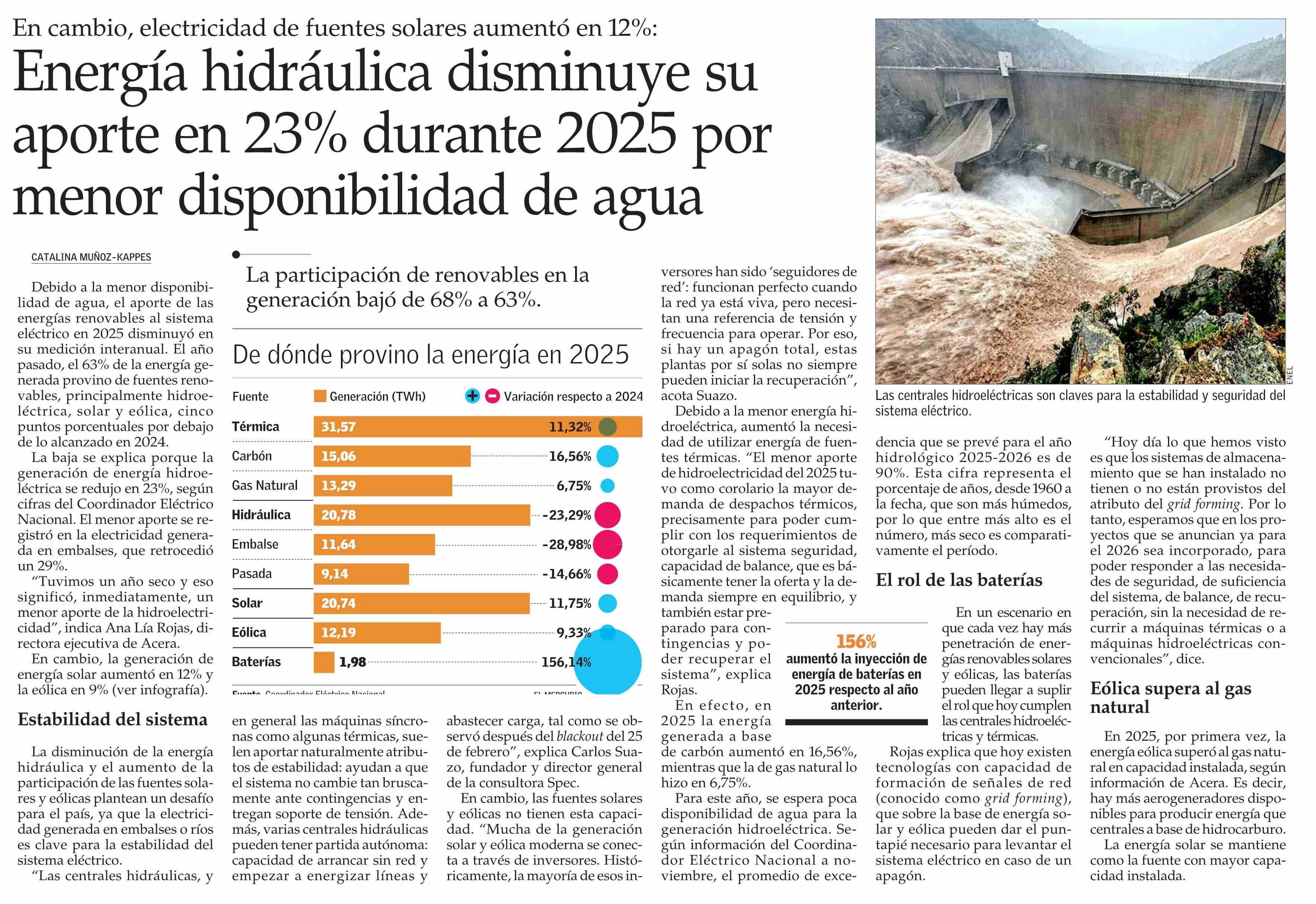 Título: Energía hidráulica disminuye su aporte en 23% durante 2025 por menor disponibilidad de agua
