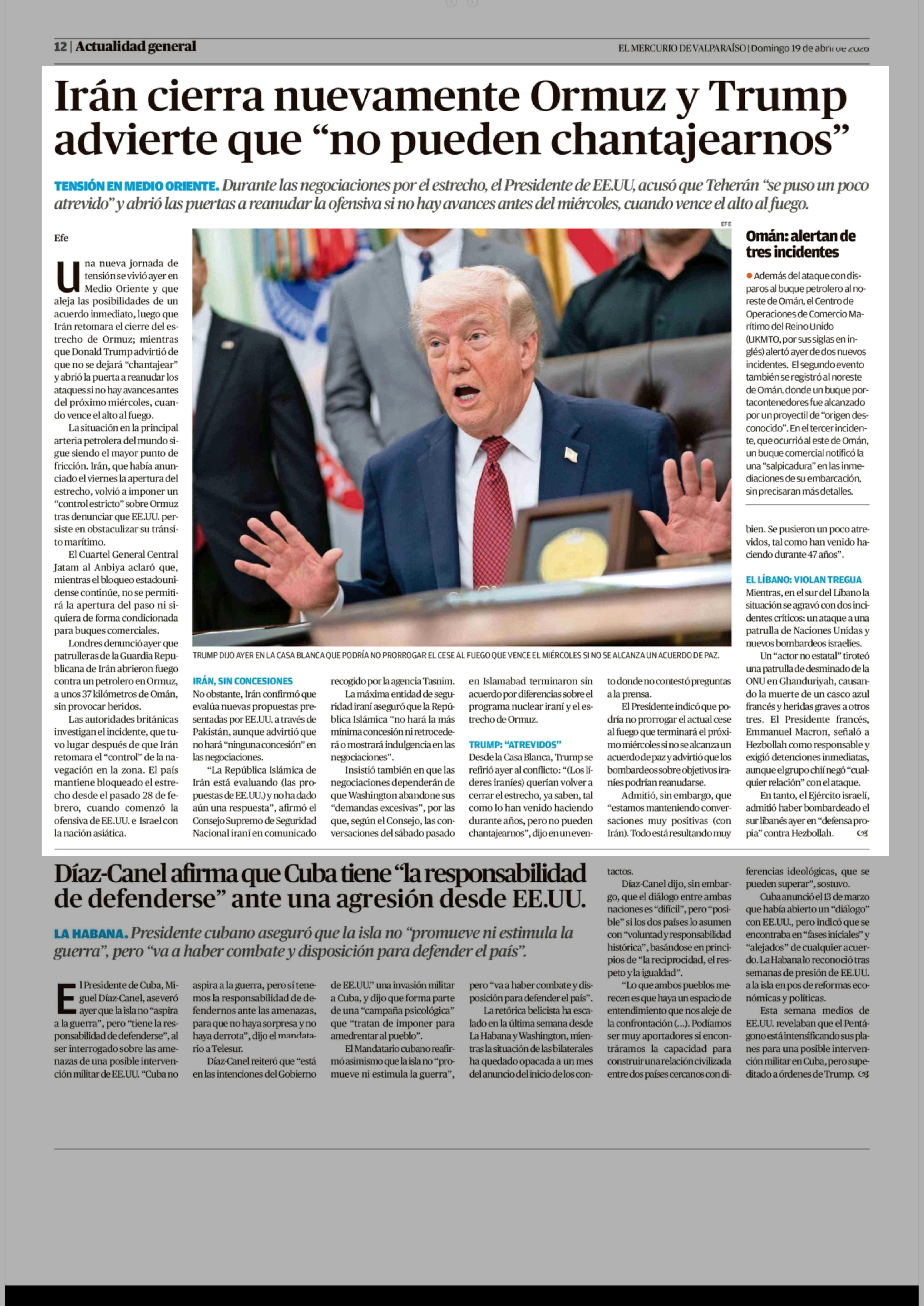 Iran cierra nuevamente Ormuz y Trump advierte que "no pueden chantajearnos" 19-04-2026 El Mercurio de Valparaíso |