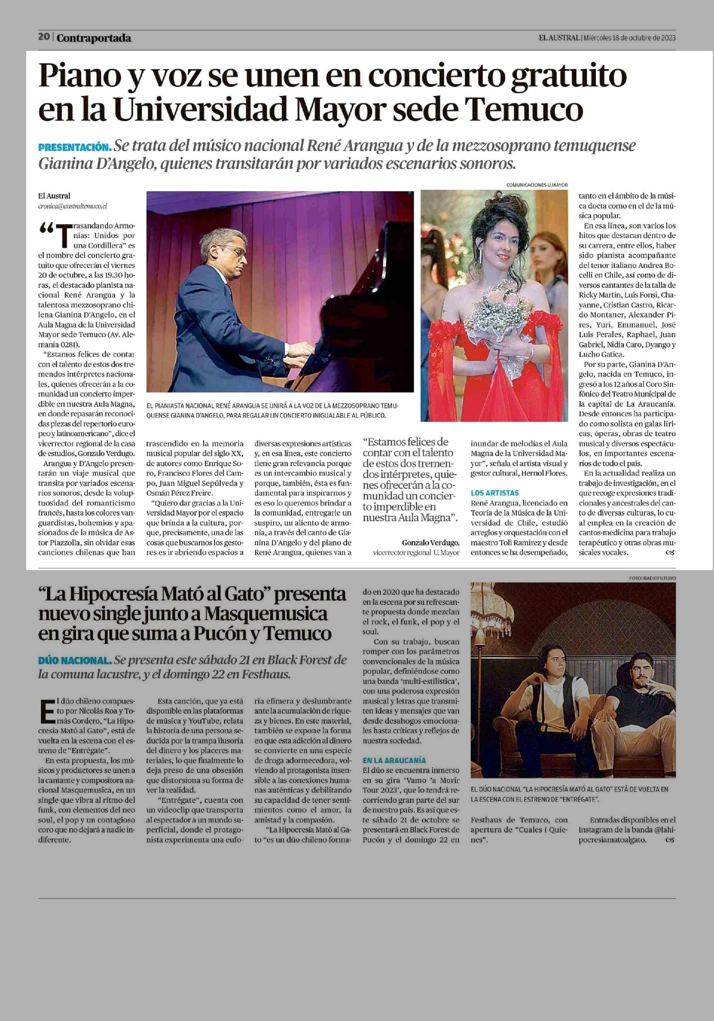 Piano y voz se unen en concierto gratuito en la Universidad Mayor sede Temuco 18-10-2023 El Austral de la Araucanía |