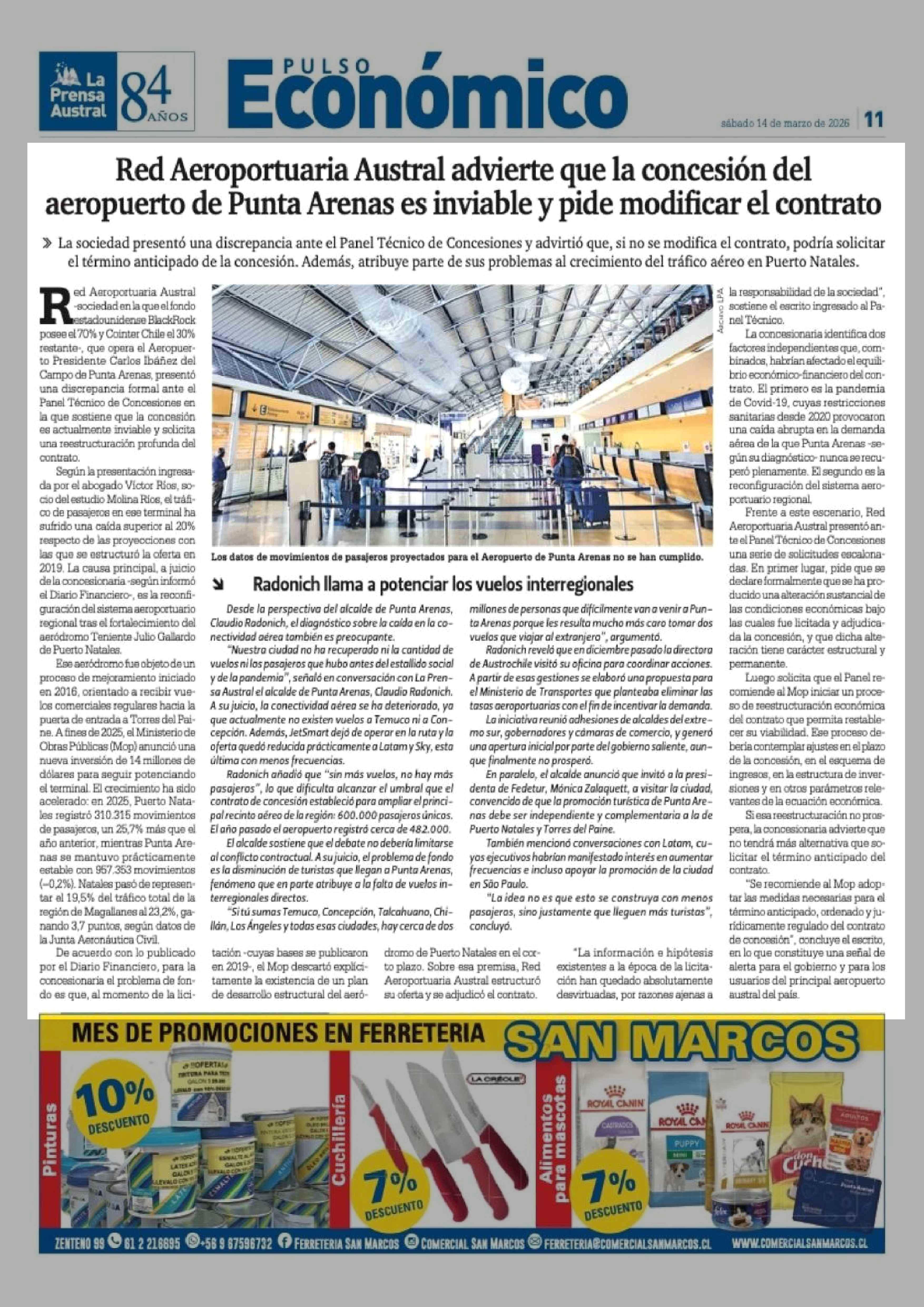 Red Aeroportuaria Austral advierte que la concesión del aeropuerto de Punta Arenas es inviable y pide modificar el contrato 14-03-2026 La Prensa Austral |