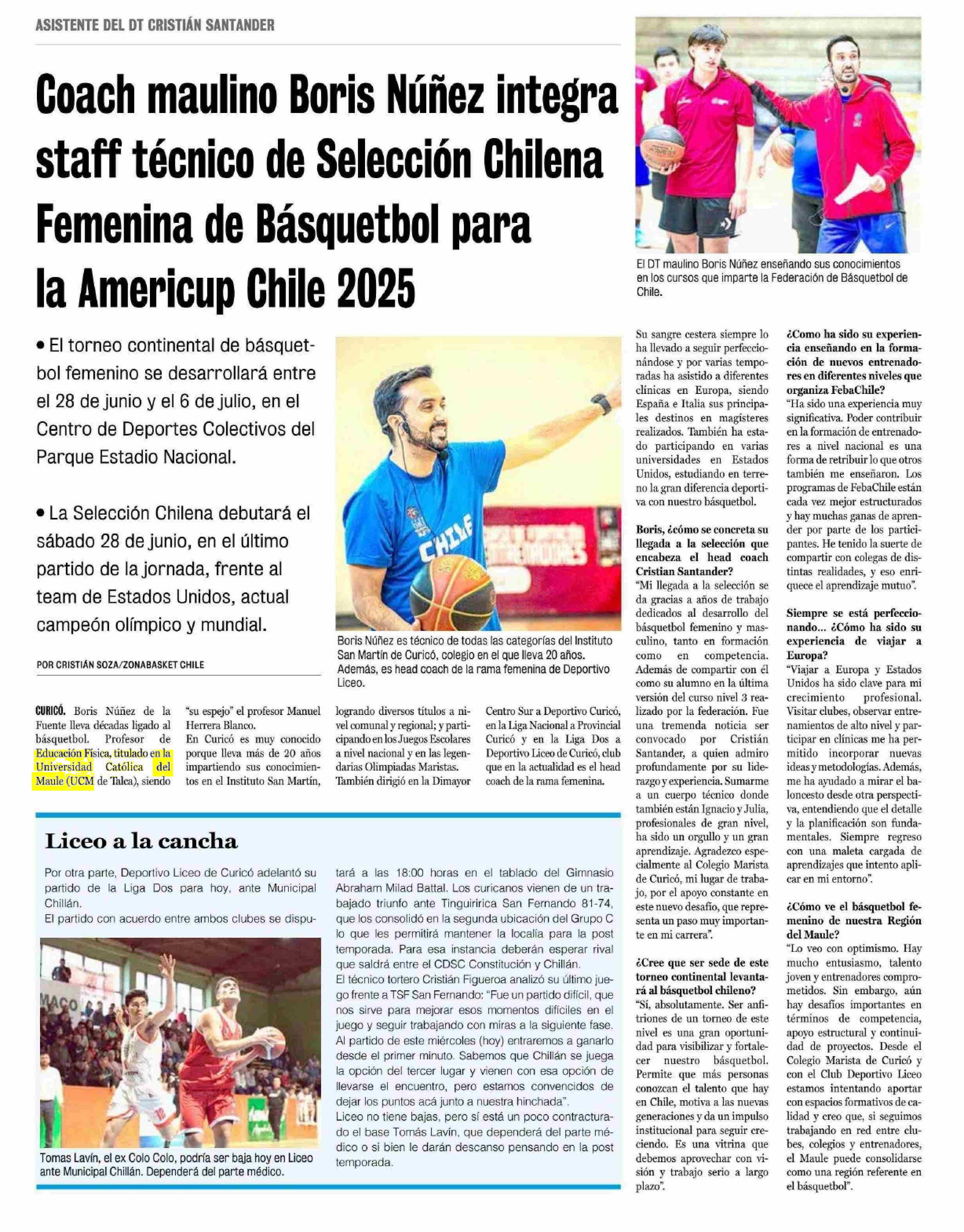 Coach maulino Boris Núñez integra staff técnico de Selección Chilena Femenina de Básquetbol para la Americup Chile 2025 21-05-2025 La Prensa de Curicó |
