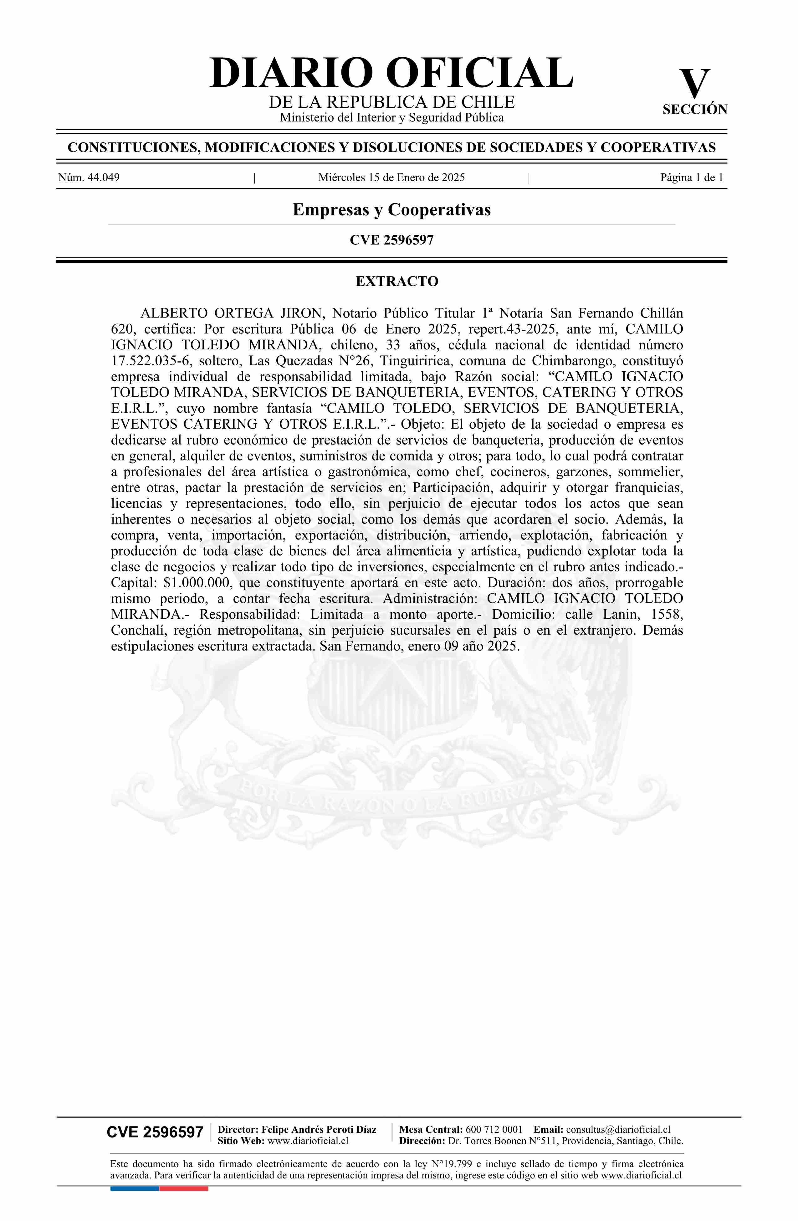 CAMILO IGNACIO TOLEDO MIRANDA, SERVICIOS DE BANQUETERIA, EVENTOS, CATERING Y OTROS E.I.R.L. 15-01-2025 Diario Oficial Edición Electrónica |