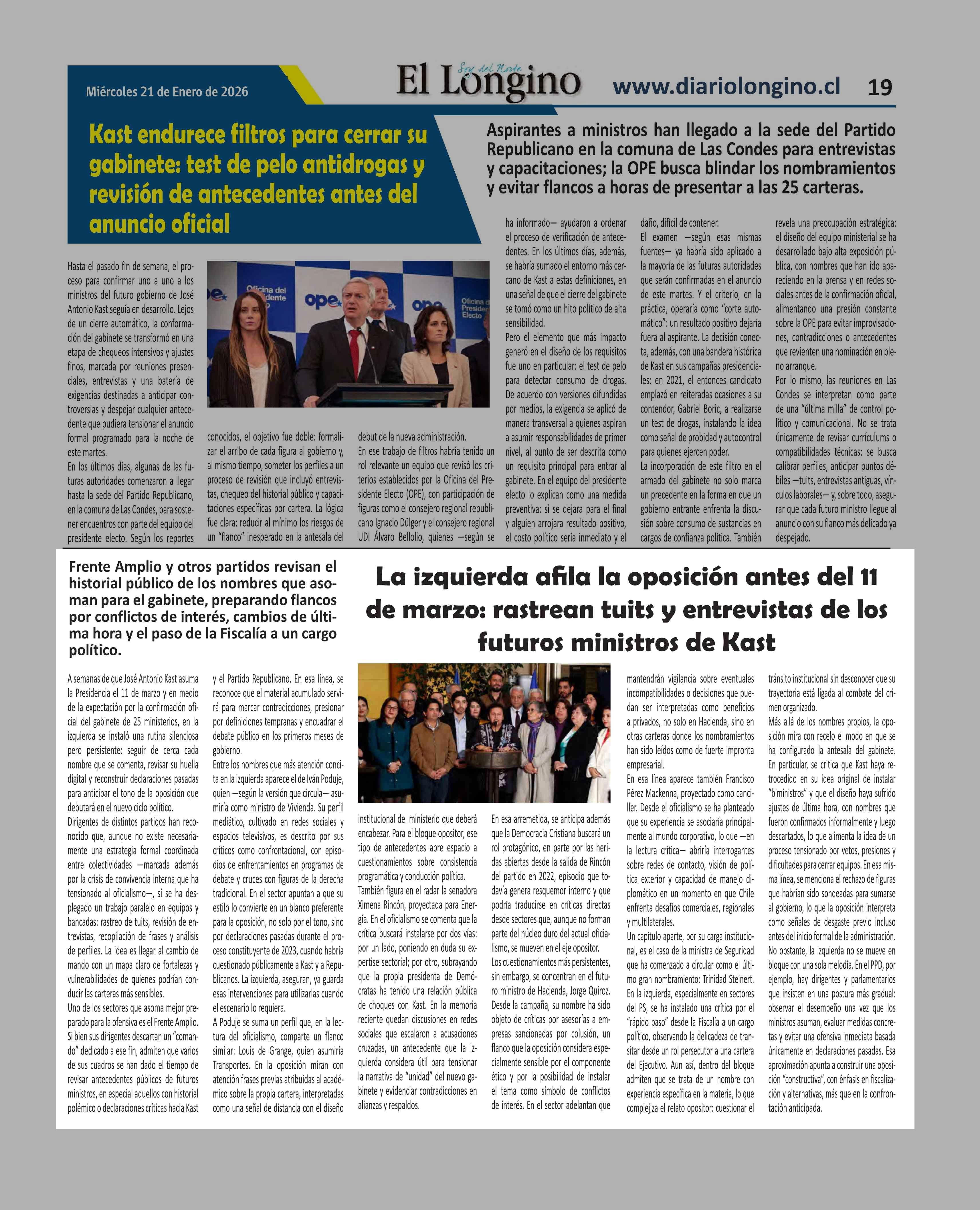 Título: La izquierda afila la oposición antes del 11 de marzo: rastrean tuits y entrevistas de los futuros ministros de Kast