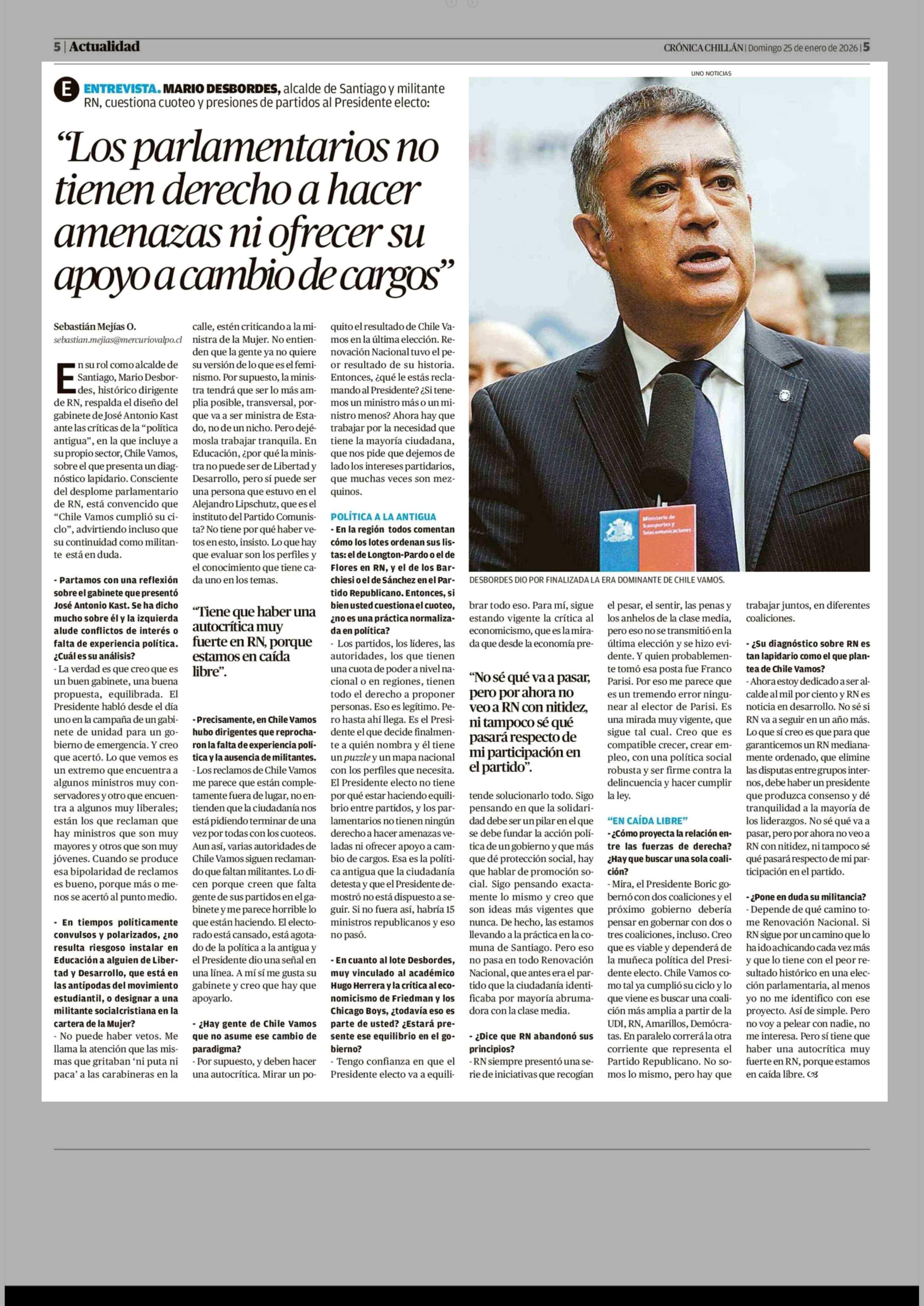 "Los parlamentarios no tienen derecho a hacer amenazas ni ofrecer su apoyo a cambio de cargos" 25-01-2026 Crónica de Chillán |