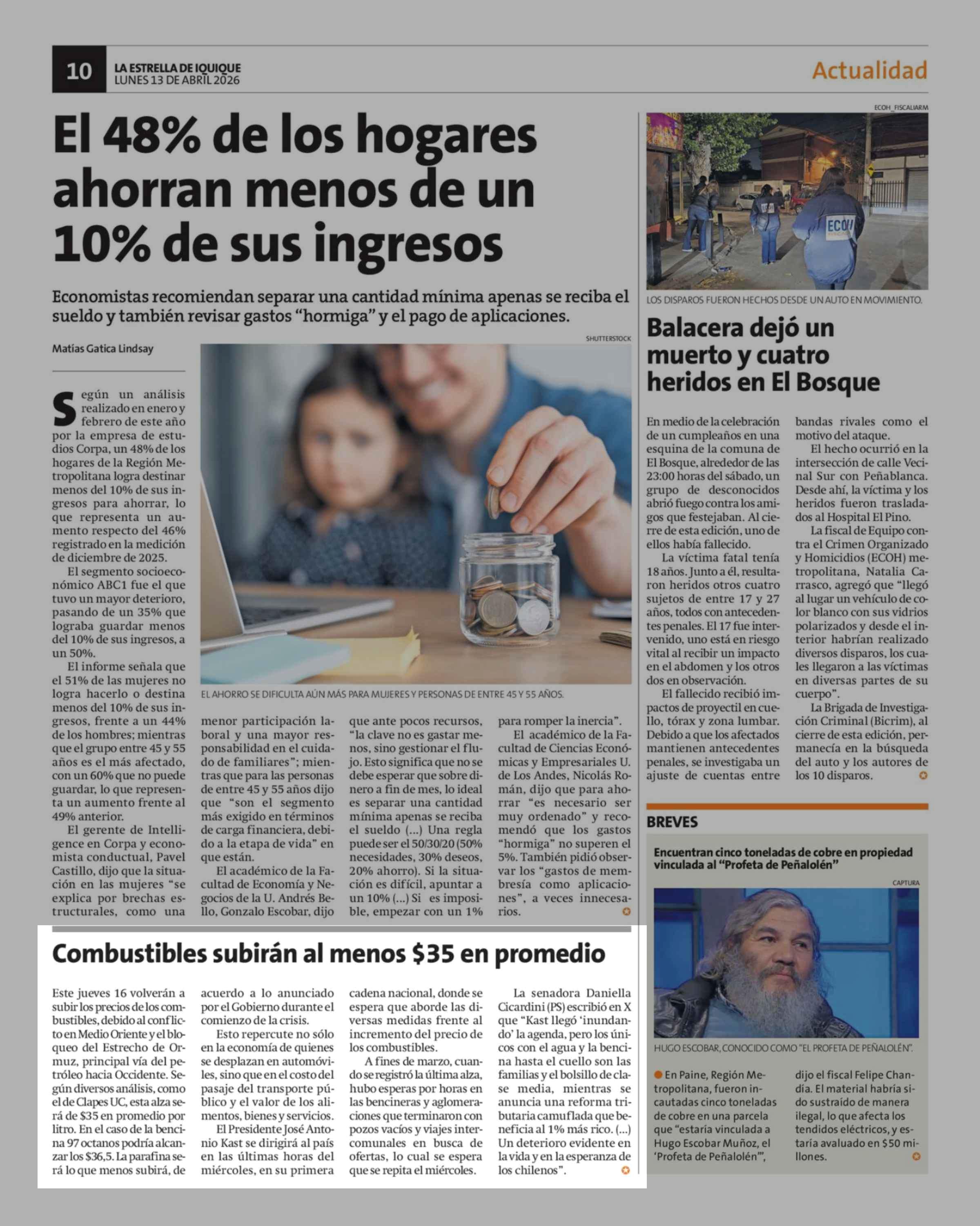 Combustibles subirán al menos $35 en promedio 13-04-2026 La Estrella de Iquique |