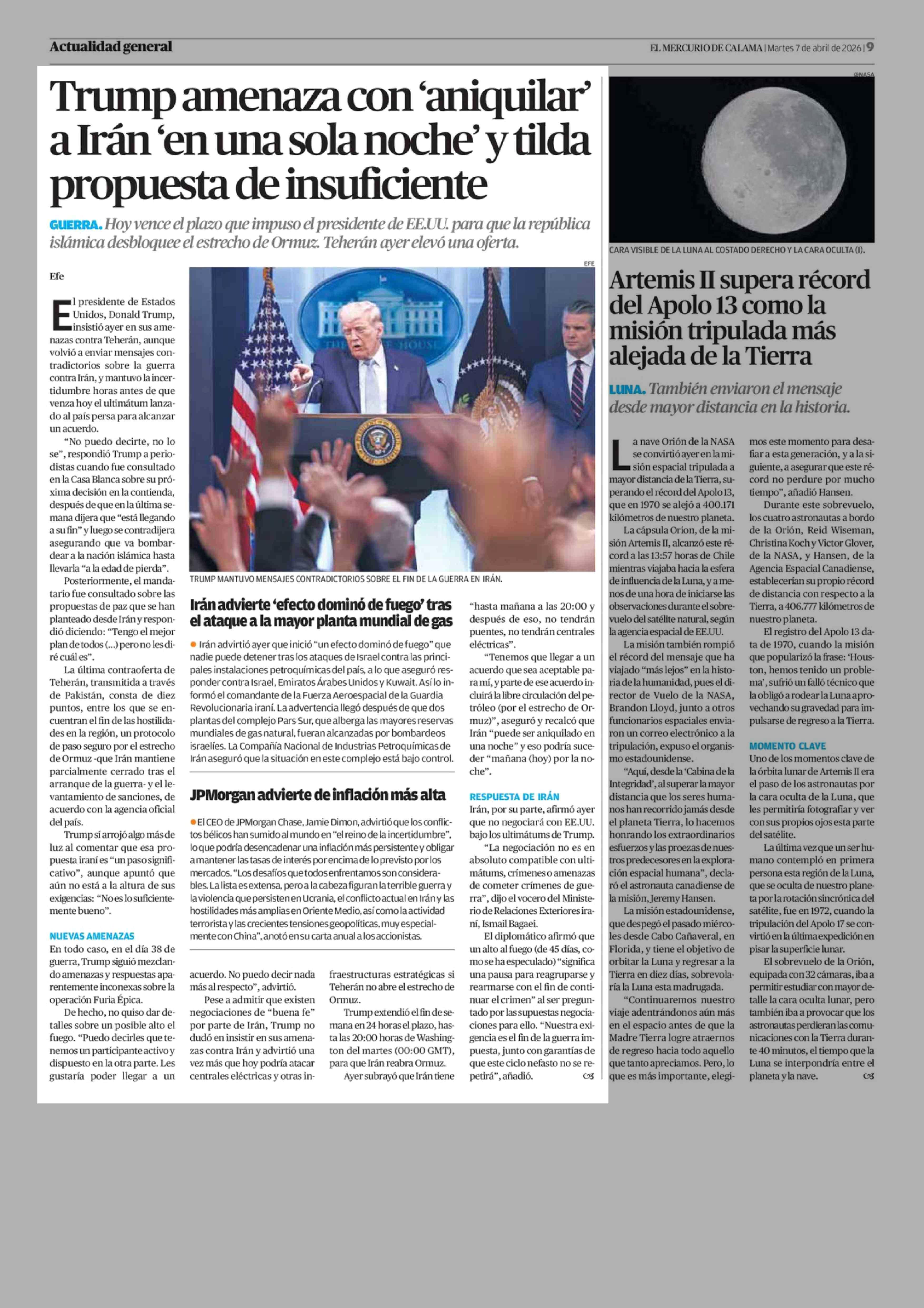 Trump amenaza con 'aniquilar' a Irán 'en una sola noche' y tilda propuesta de insuficiente 07-04-2026 El Mercurio de Calama |