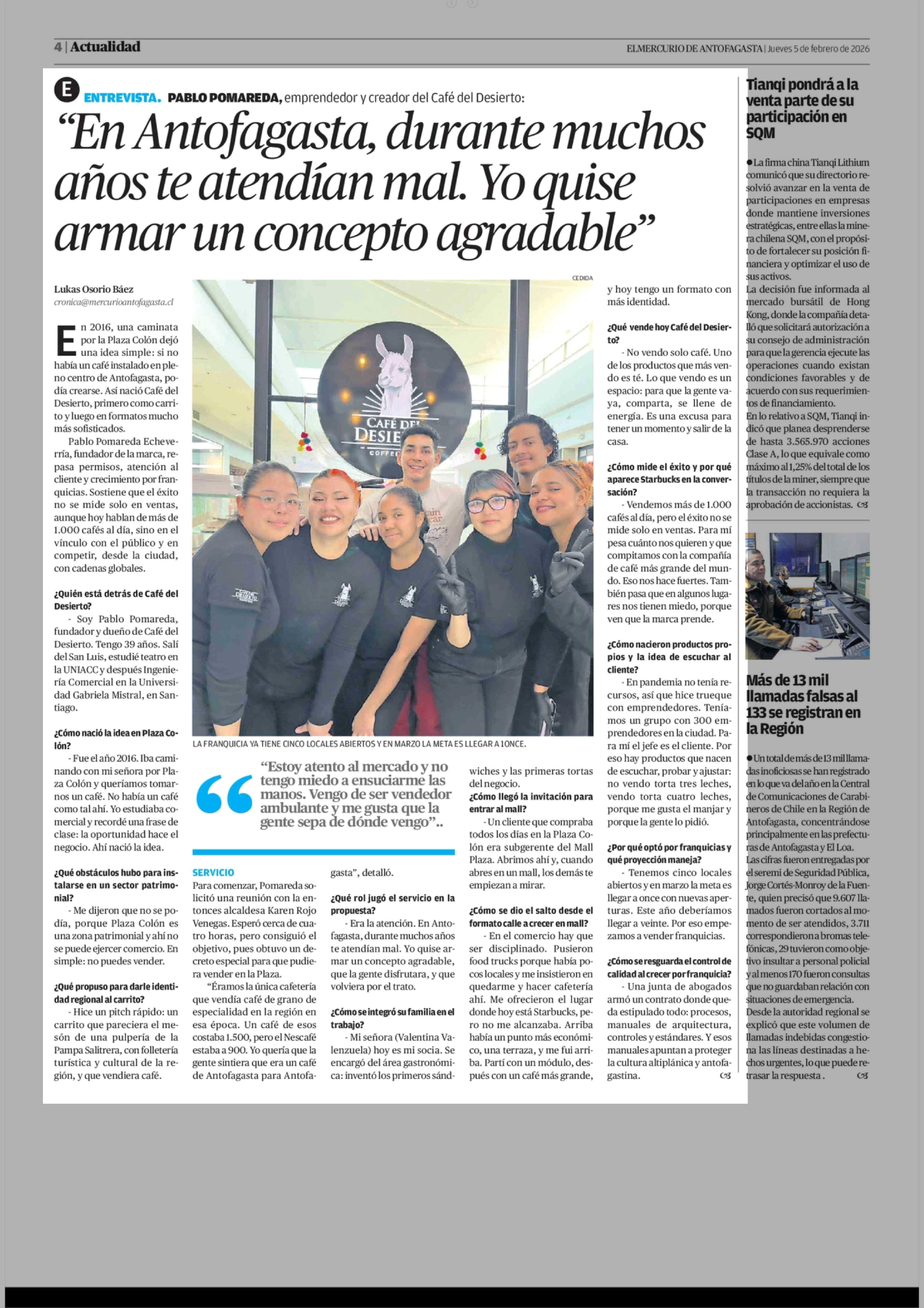 "En Antofagasta, durante muchos años te atendían mal. Yo quise armar un concepto agradable" 05-02-2026 El Mercurio de Antofagasta |