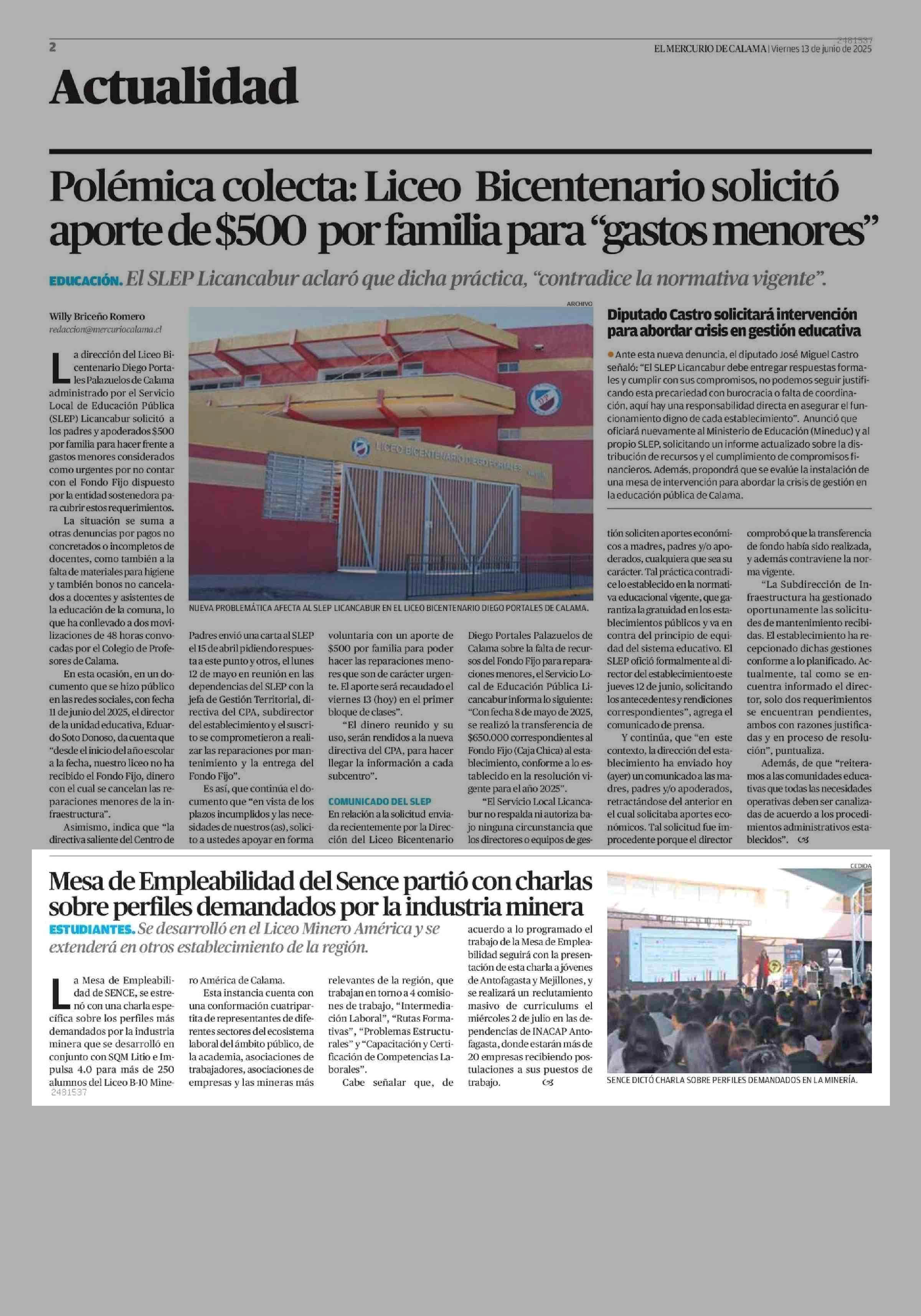 Mesa de Empleabilidad del Sence partió con charlas sobre perfiles demandados por la industria minera 13-06-2025 El Mercurio de Calama |