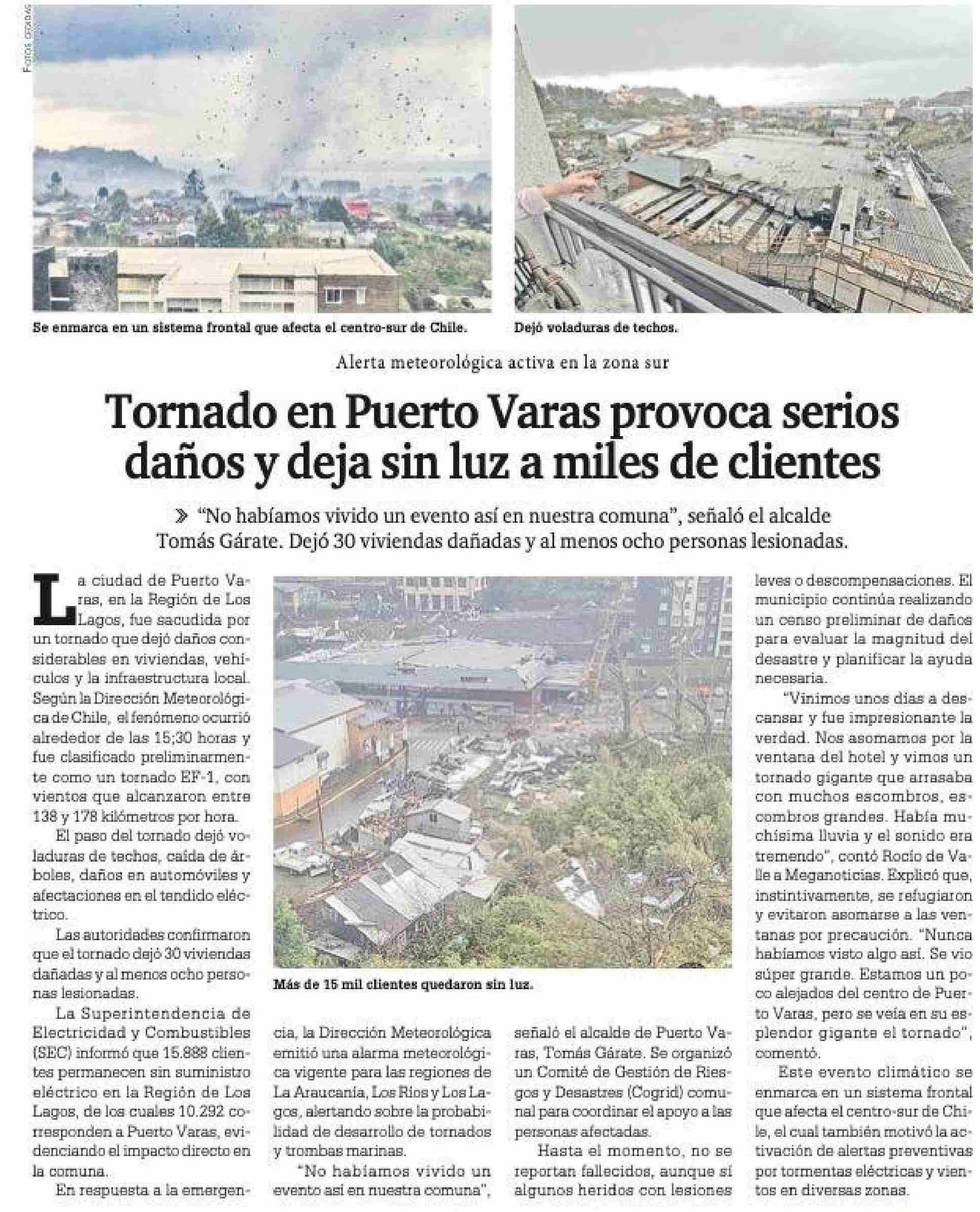 | Título: | Tornado en Puerto Varas provoca serios daños y deja sin luz a miles de clientes |