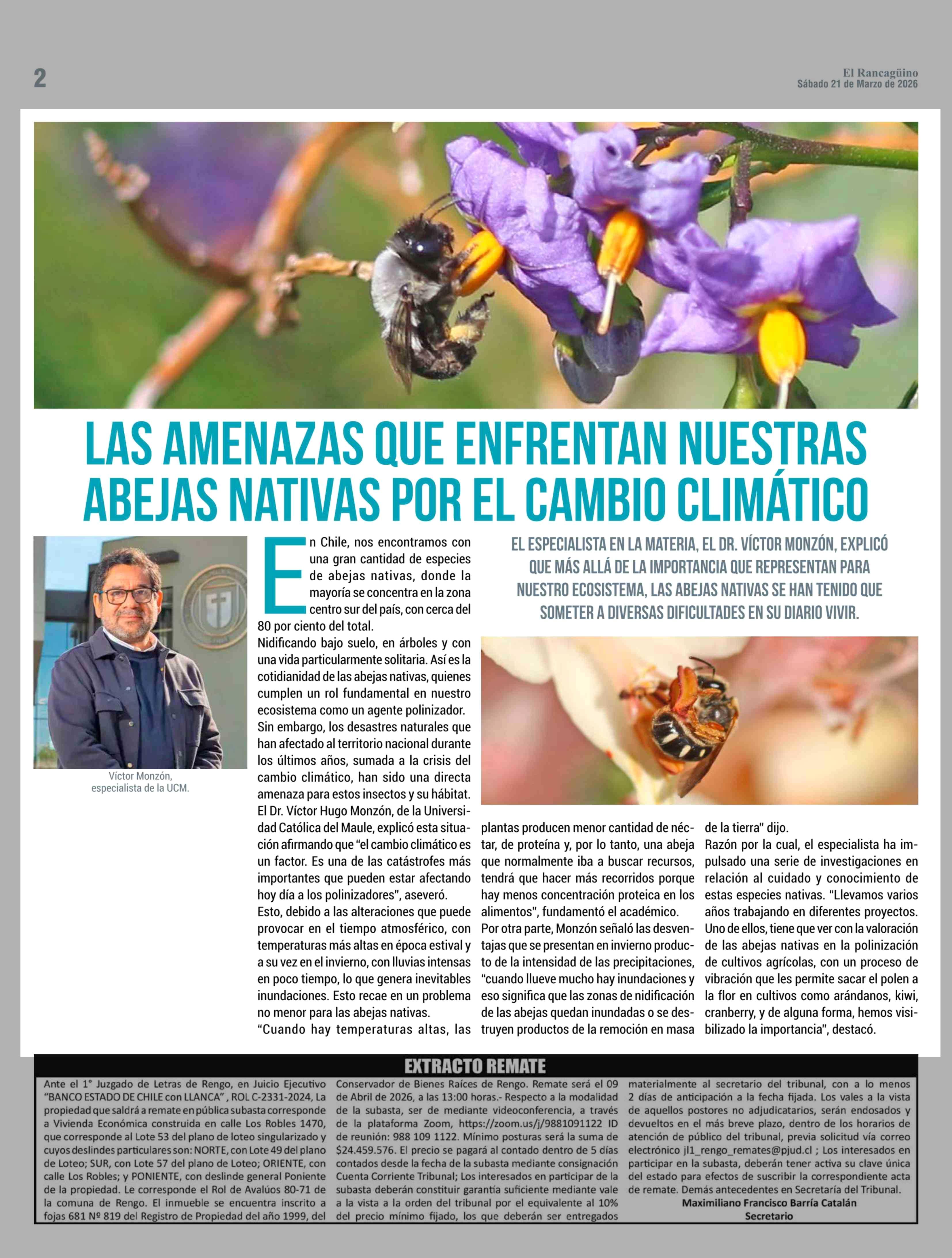 LAS AMENAZAS QUE ENFRENTAN NUESTRAS ABEJAS NATIVAS POR EL CAMBIO CLIMÁTICO 21-03-2026 El Rancagüino |