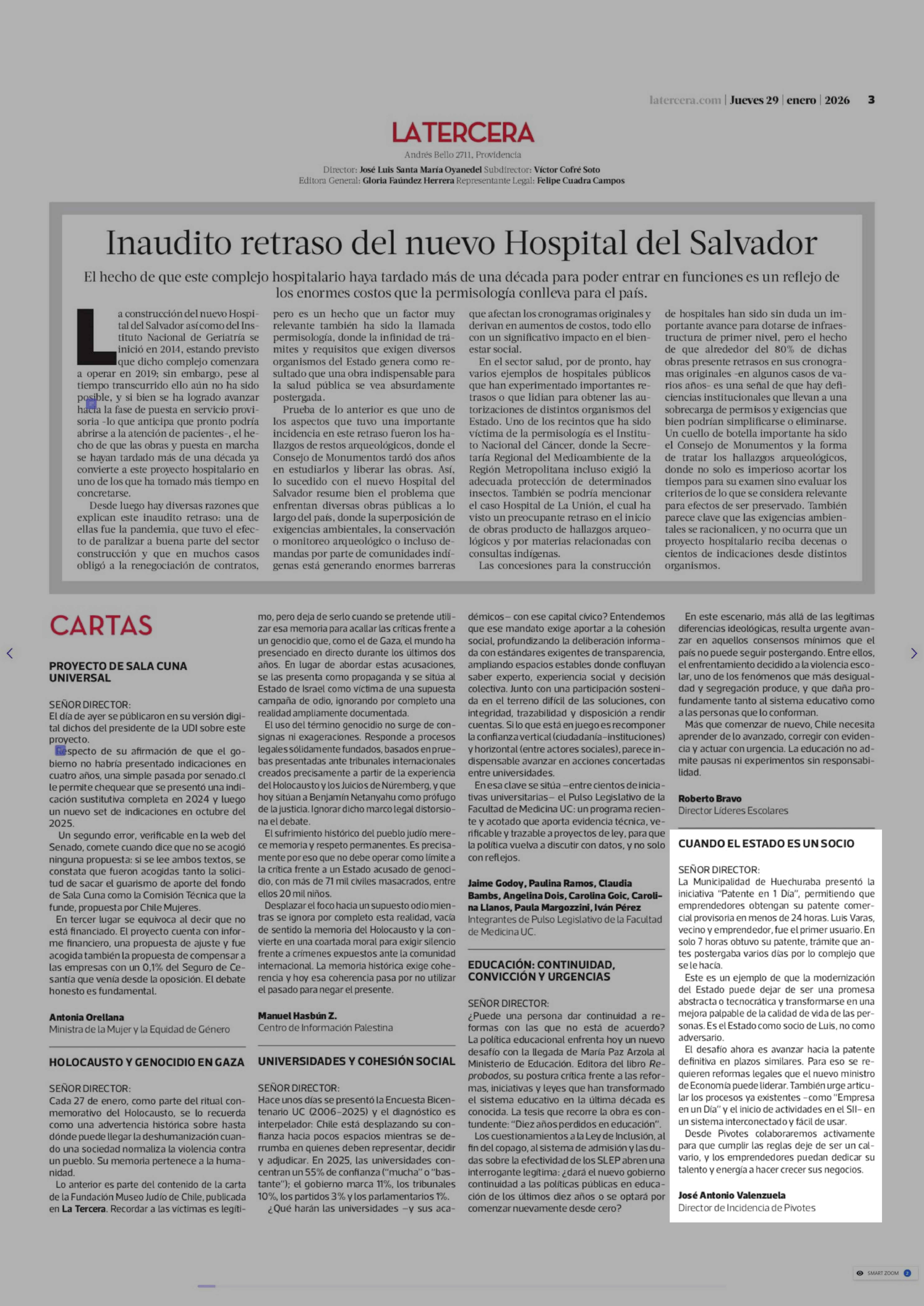 Cartas: CUANDO EL ESTADO ES UN SOCIO 29-01-2026 La Tercera |