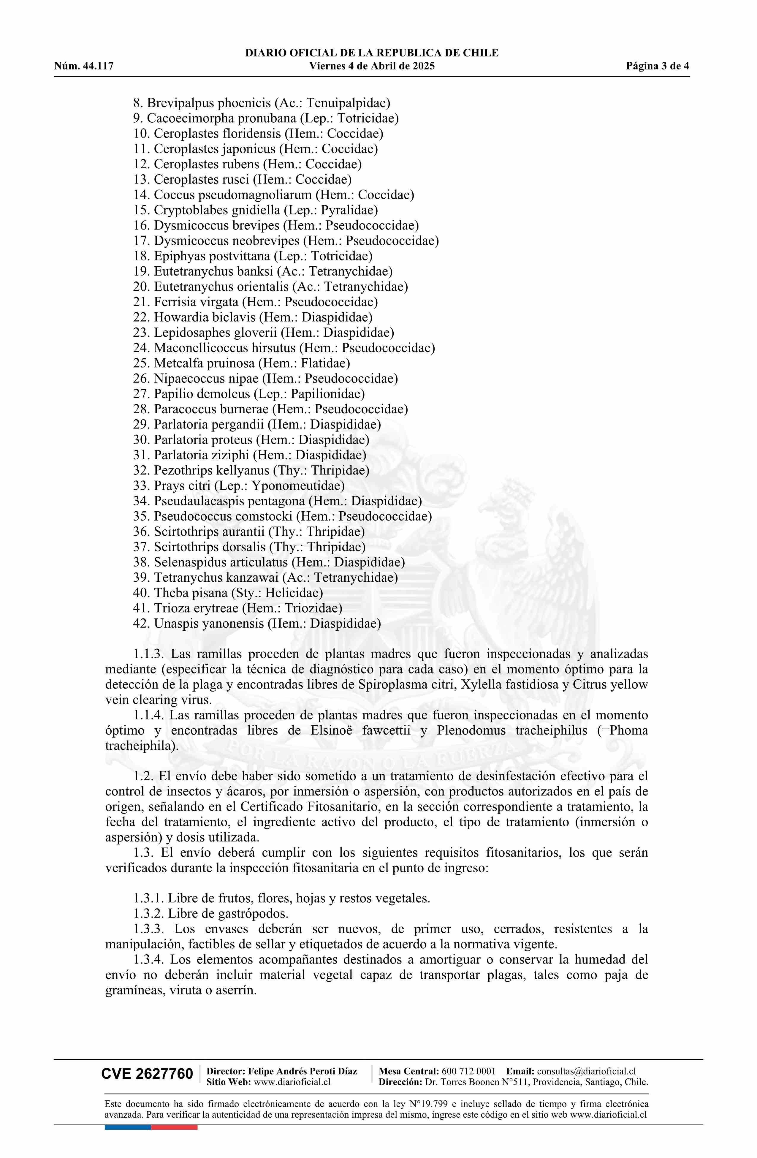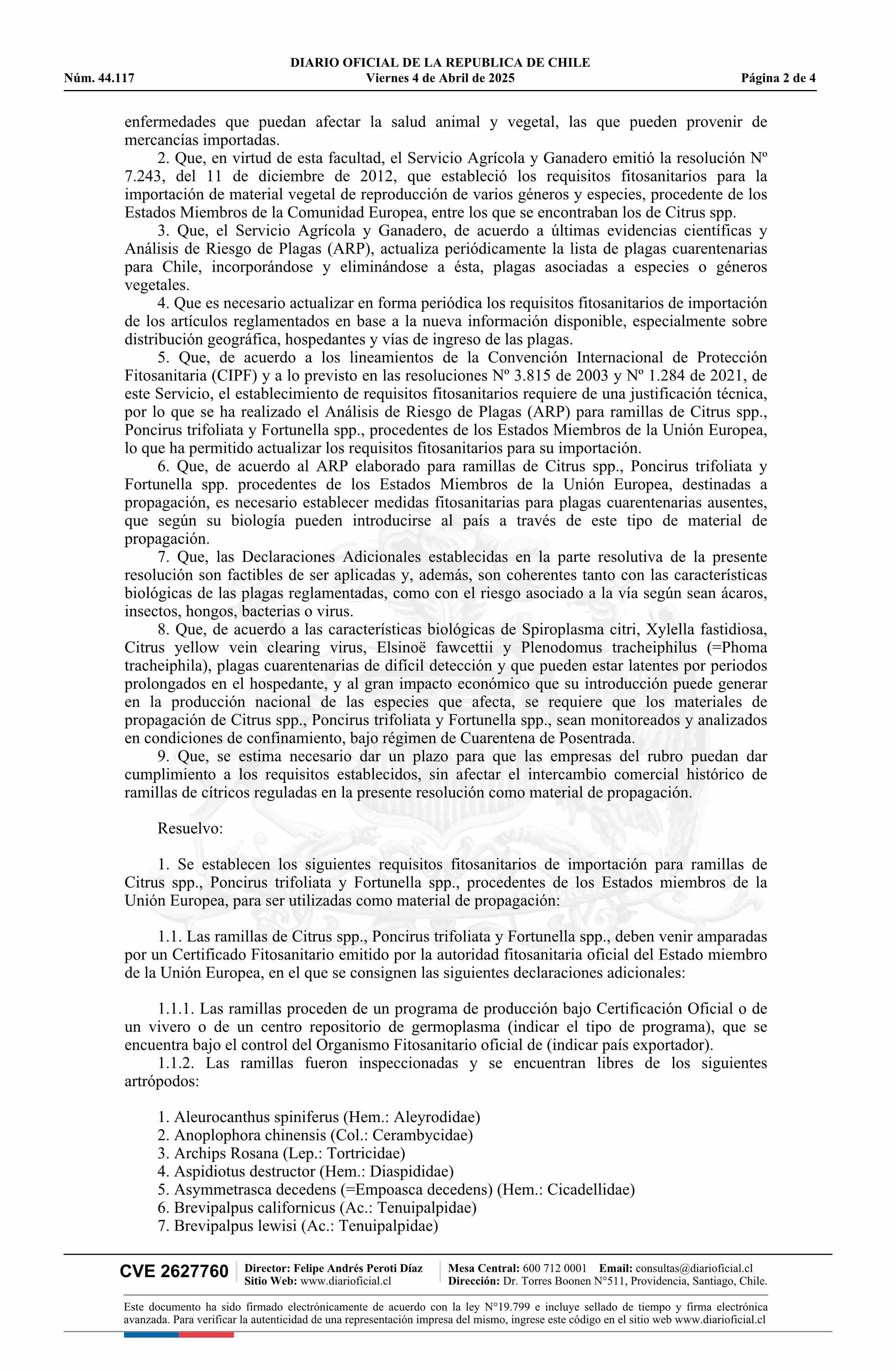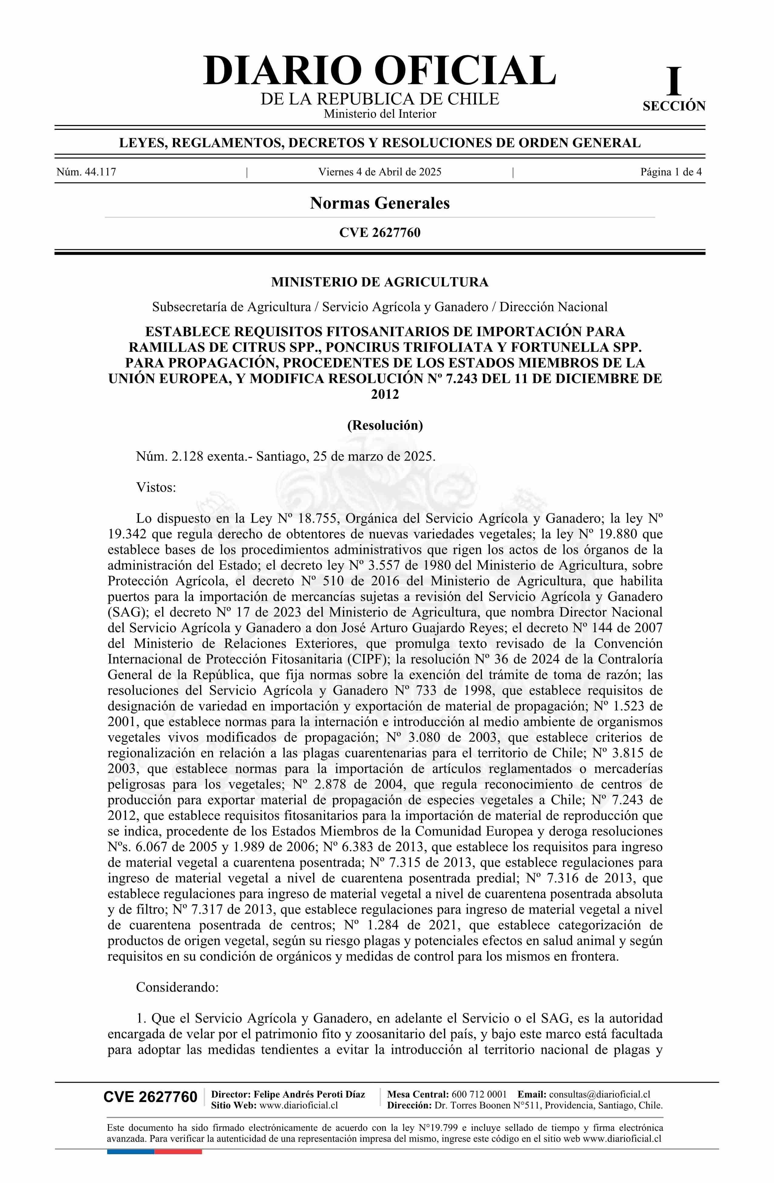 | Título: | Resolución exenta número 2.128, de 2025.- Establece requisitos fitosanitarios de importación para ramillas de Citrus spp., Poncirus trifoliata y Fortunella spp. para propagación, procedentes de los Estados Miembros de la Unión Europea, y modifica resolución Nº 7.243, de 2012 |