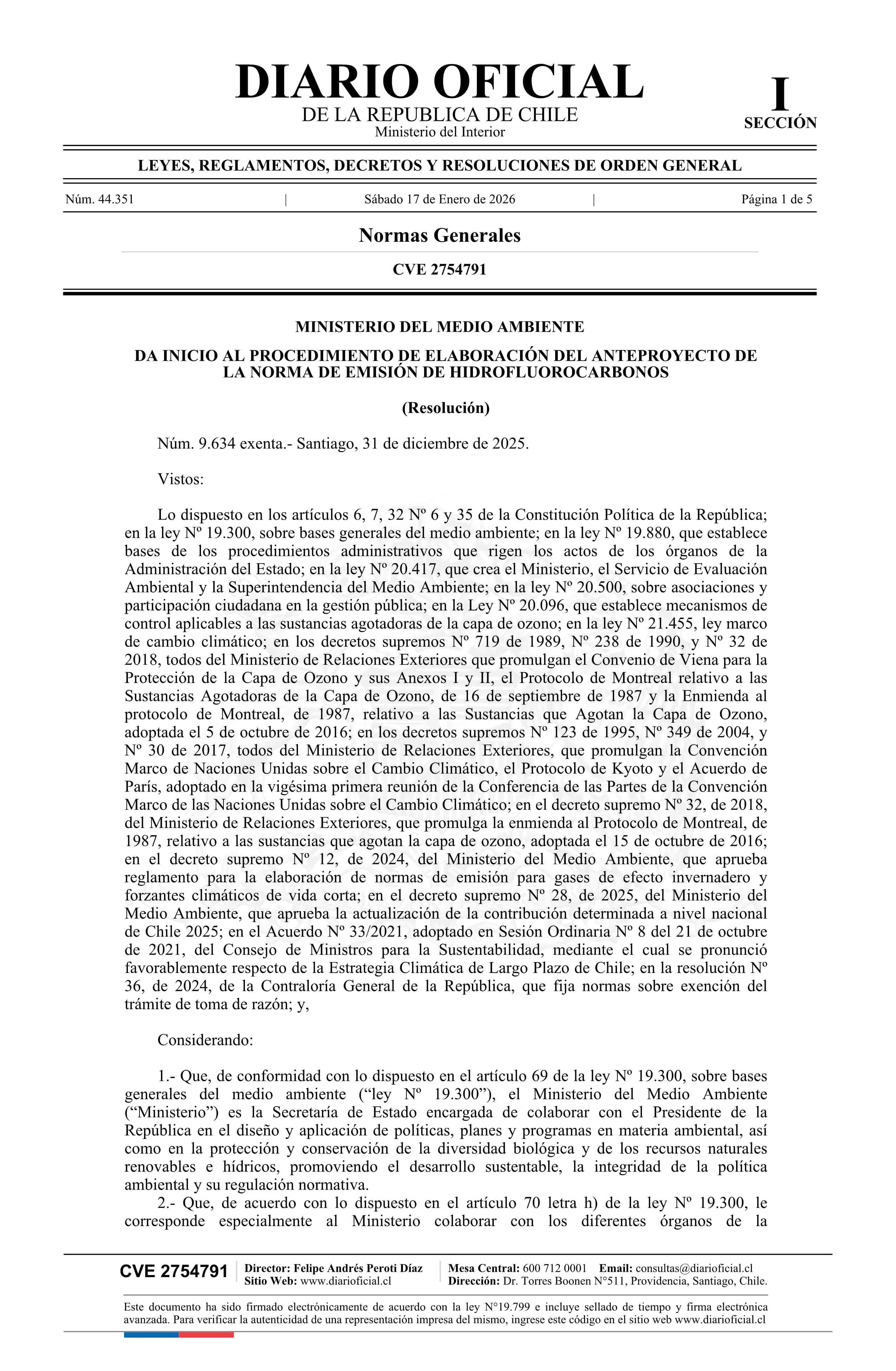 Título: Resolución exenta número 9.634, de 2025.- Da inicio al procedimiento de elaboración del anteproyecto de la Norma de Emisión de Hidrofluorocarbonos
