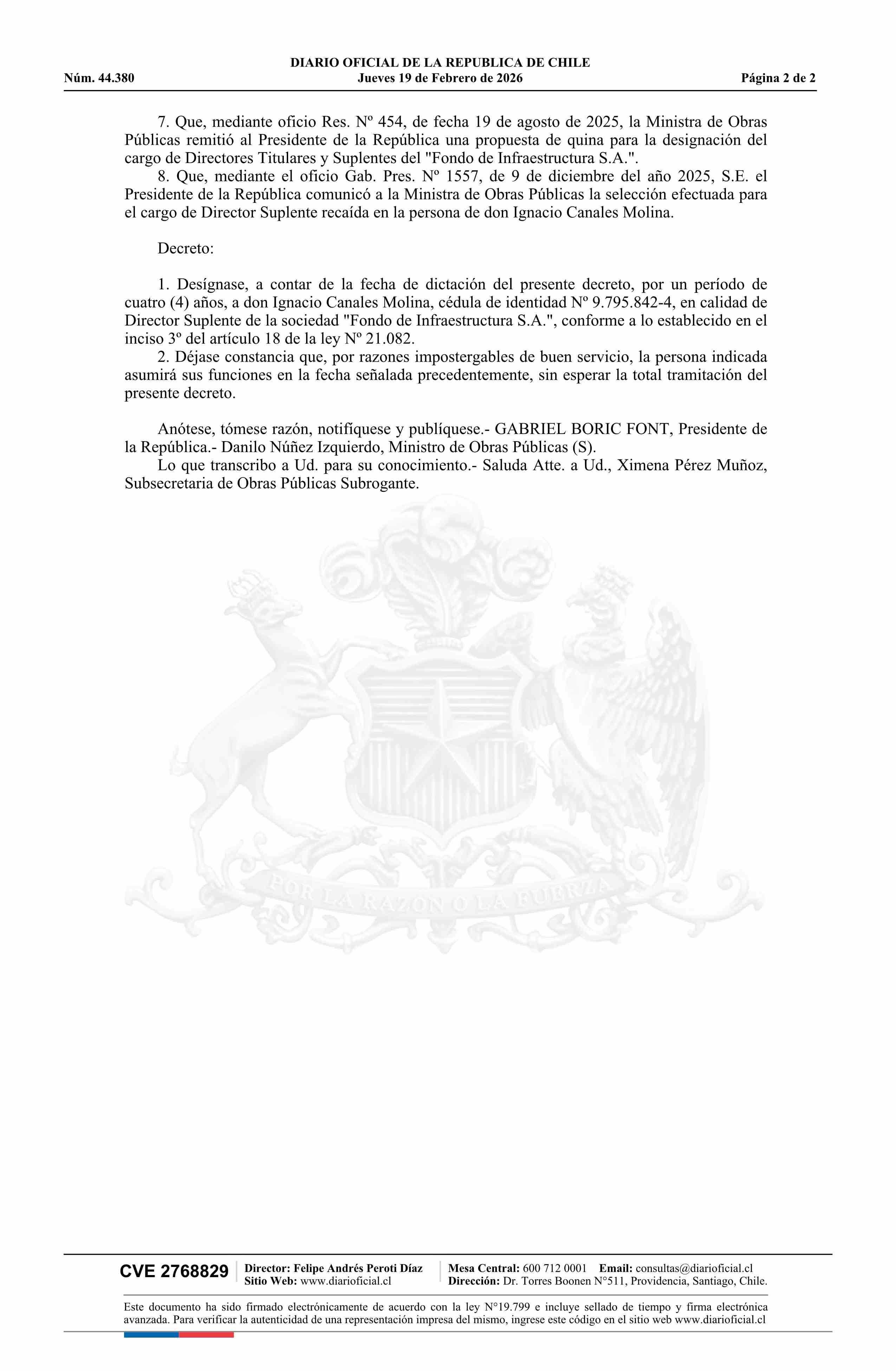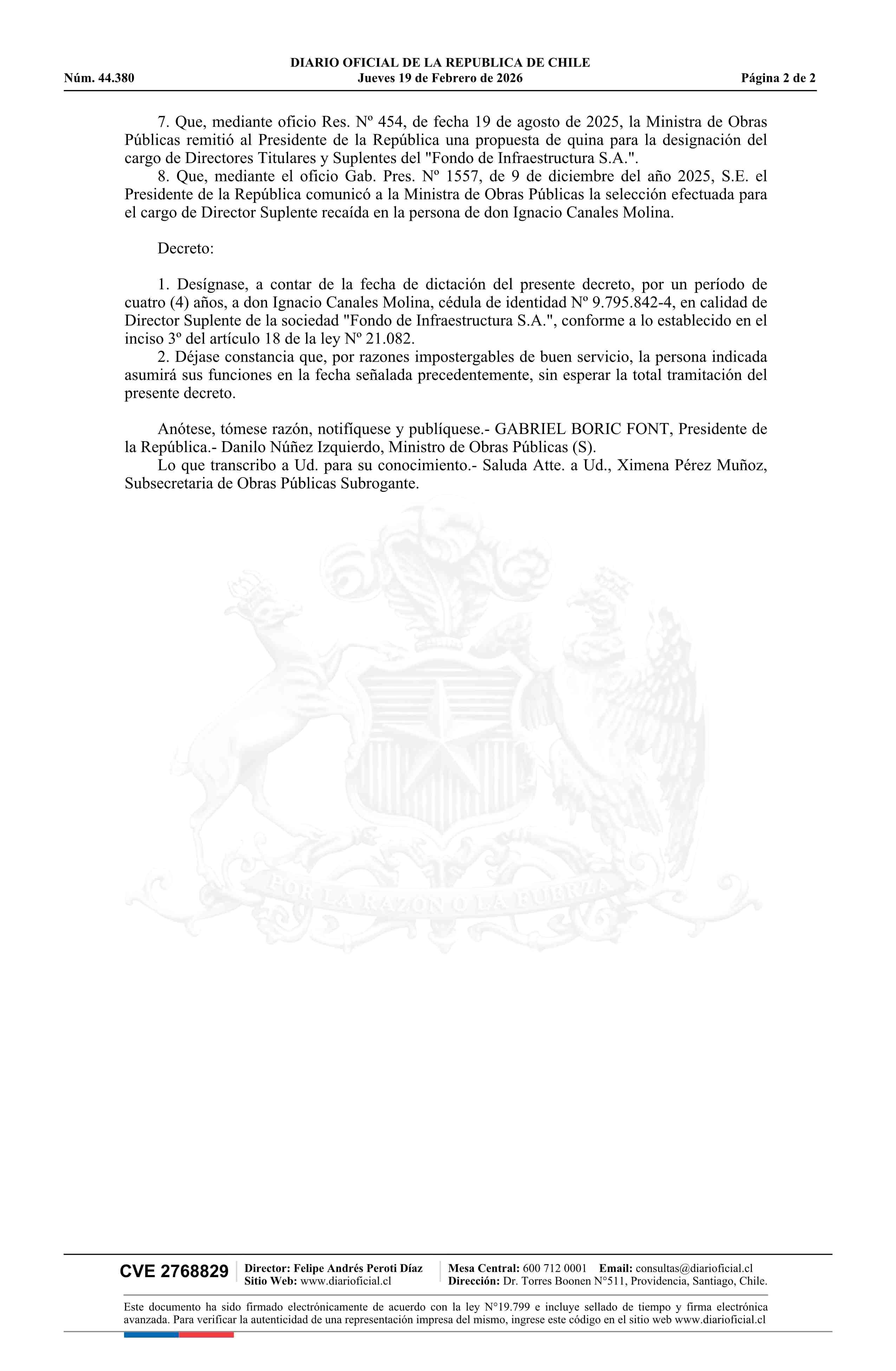 Decreto número 142, de 2025.- Designa a don Ignacio Canales Molina como director suplente de la sociedad Fondo de Infraestructura S.A., de acuerdo con el artículo 18 de la ley Nº 21.082