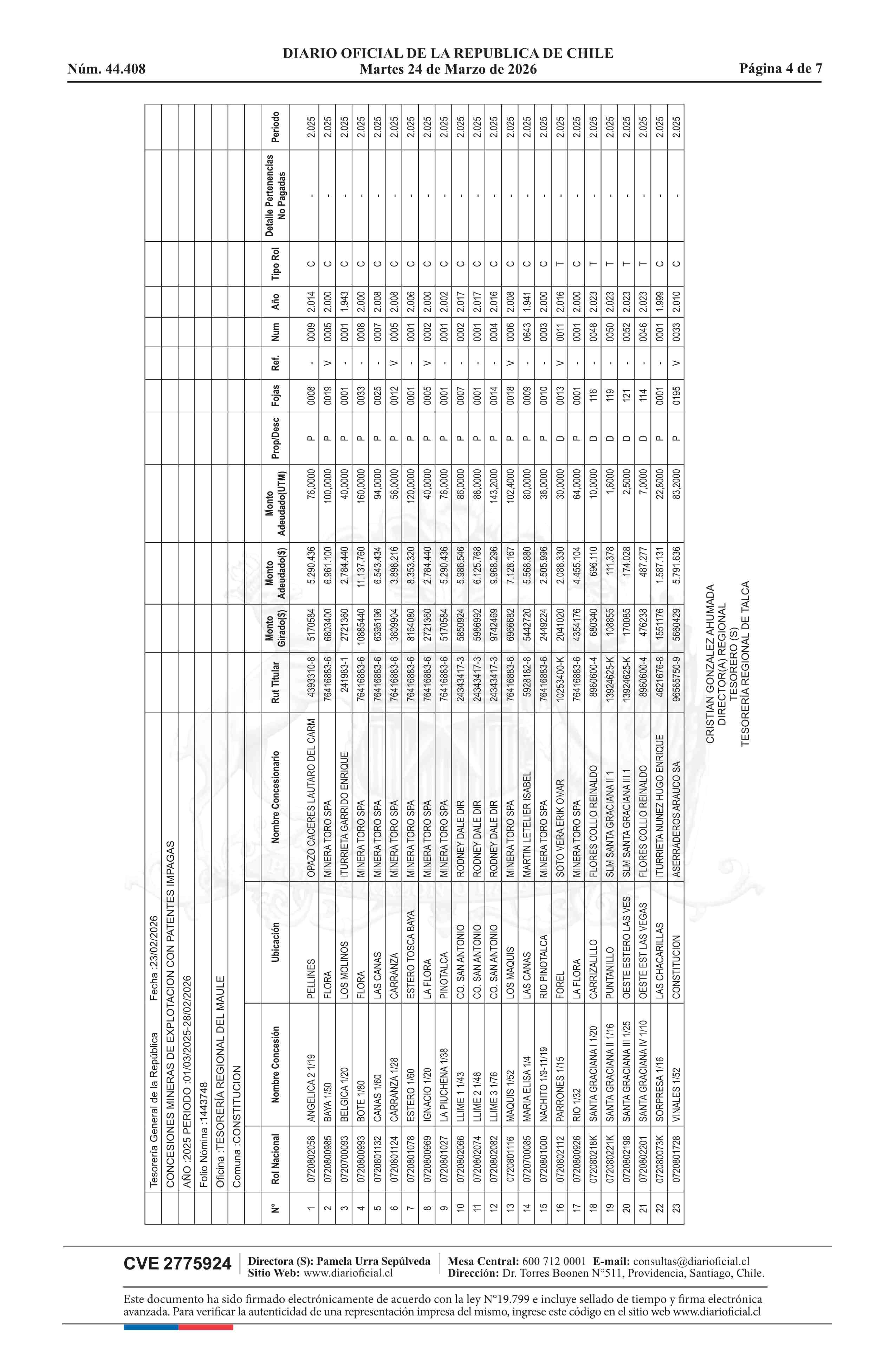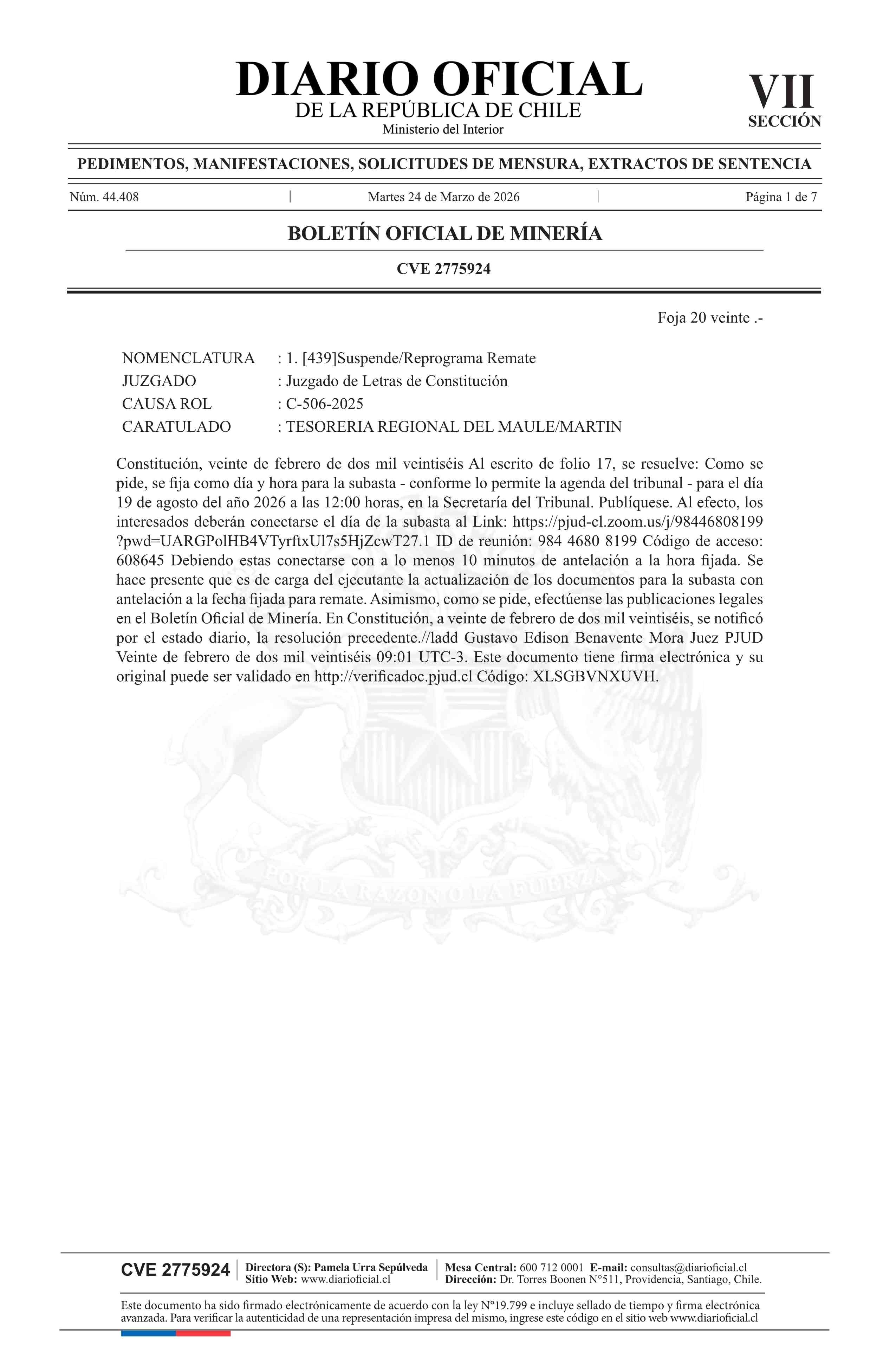 Remate de pertenencias mineras: Comunas de Constitución y Empedrado 24-03-2026 DIARIO OFICIAL CHILE - BOLETÍN OFICIAL DE MINERÍA |
