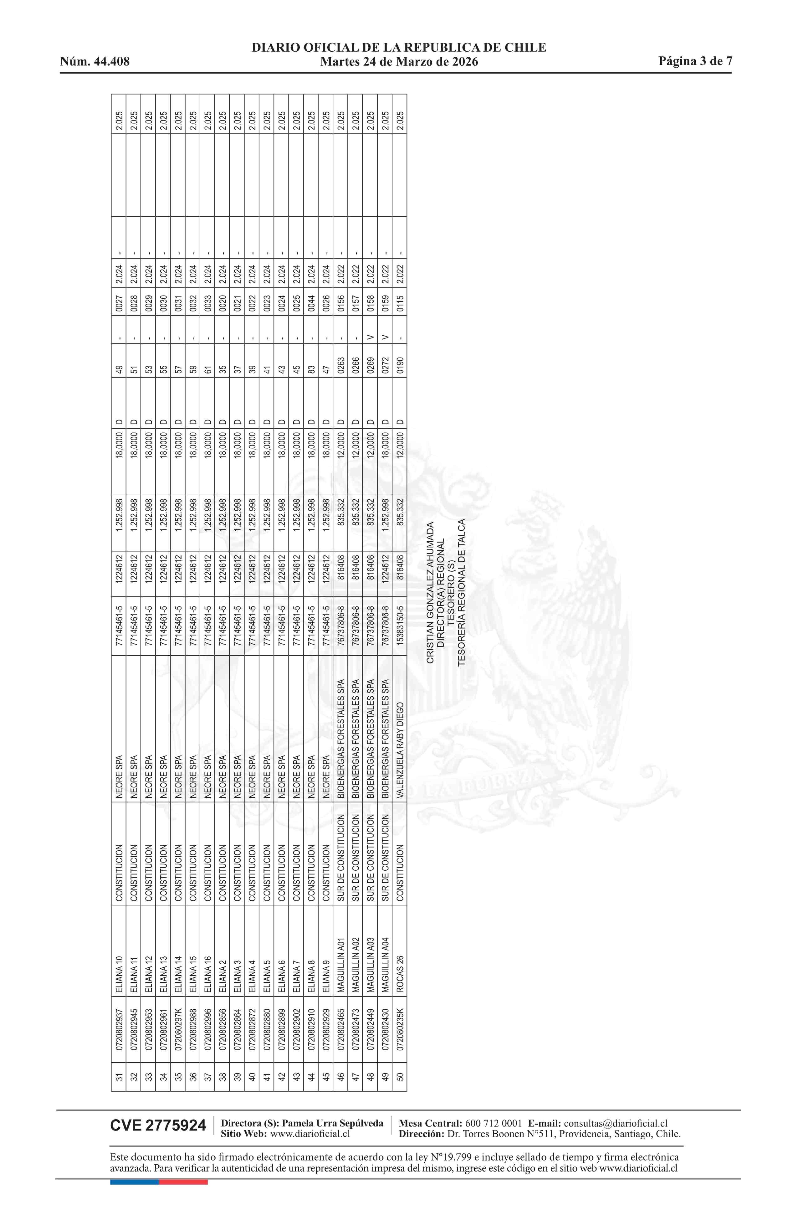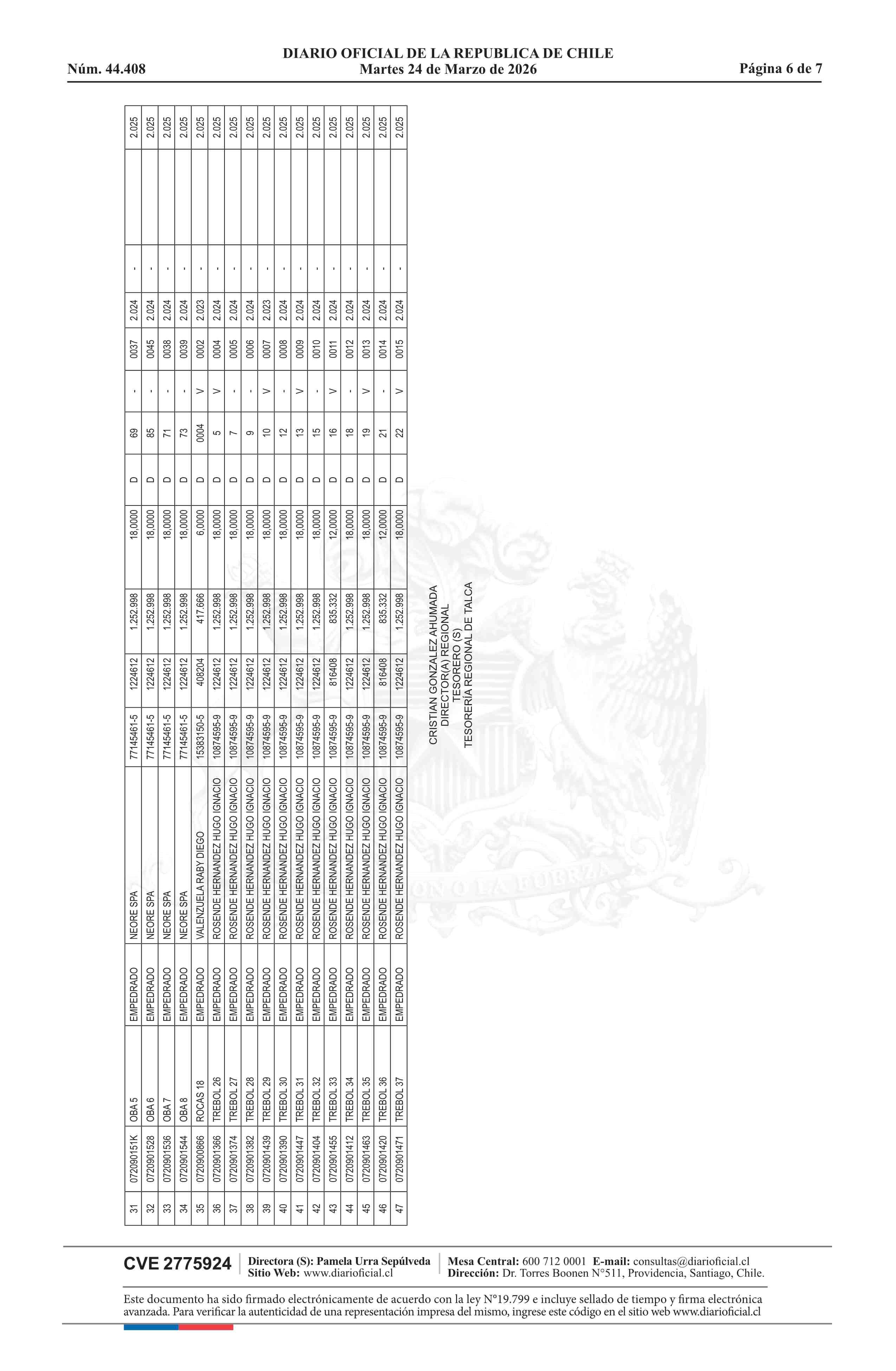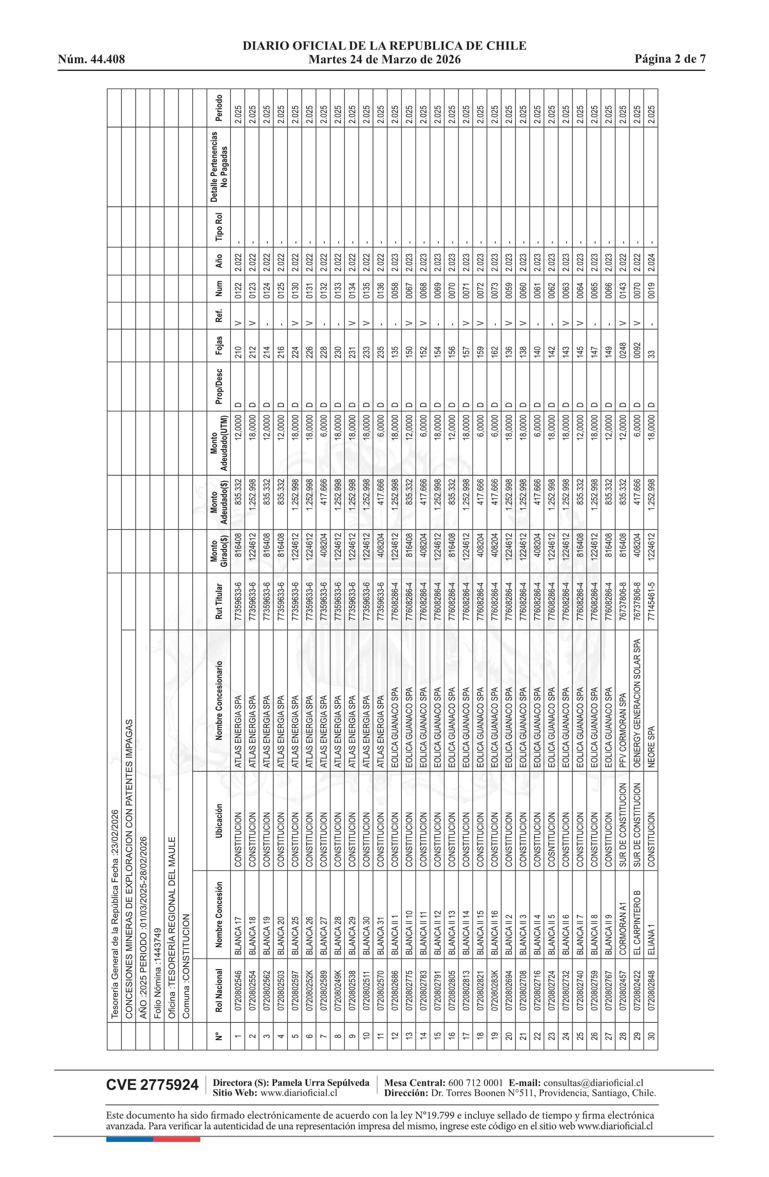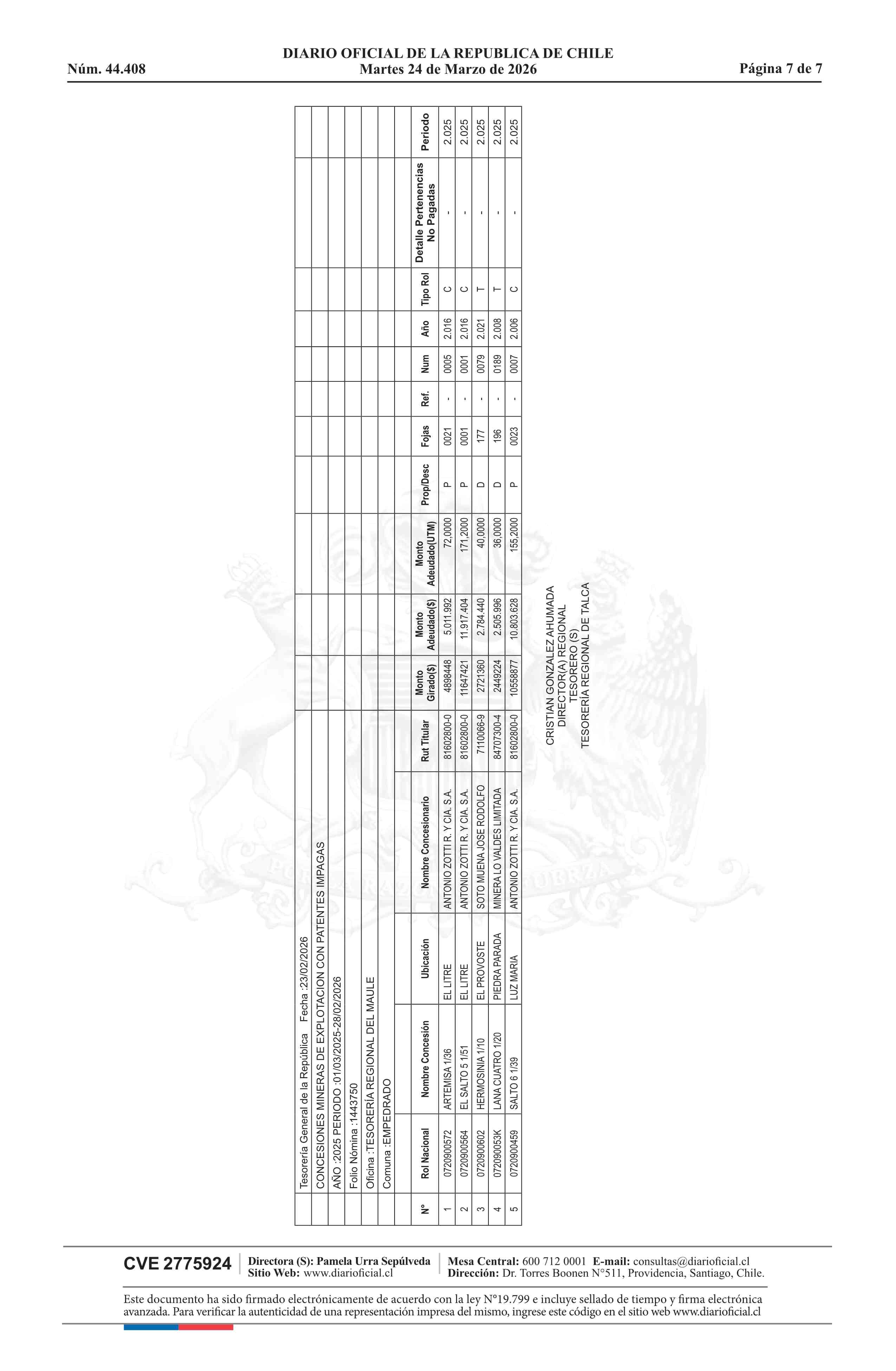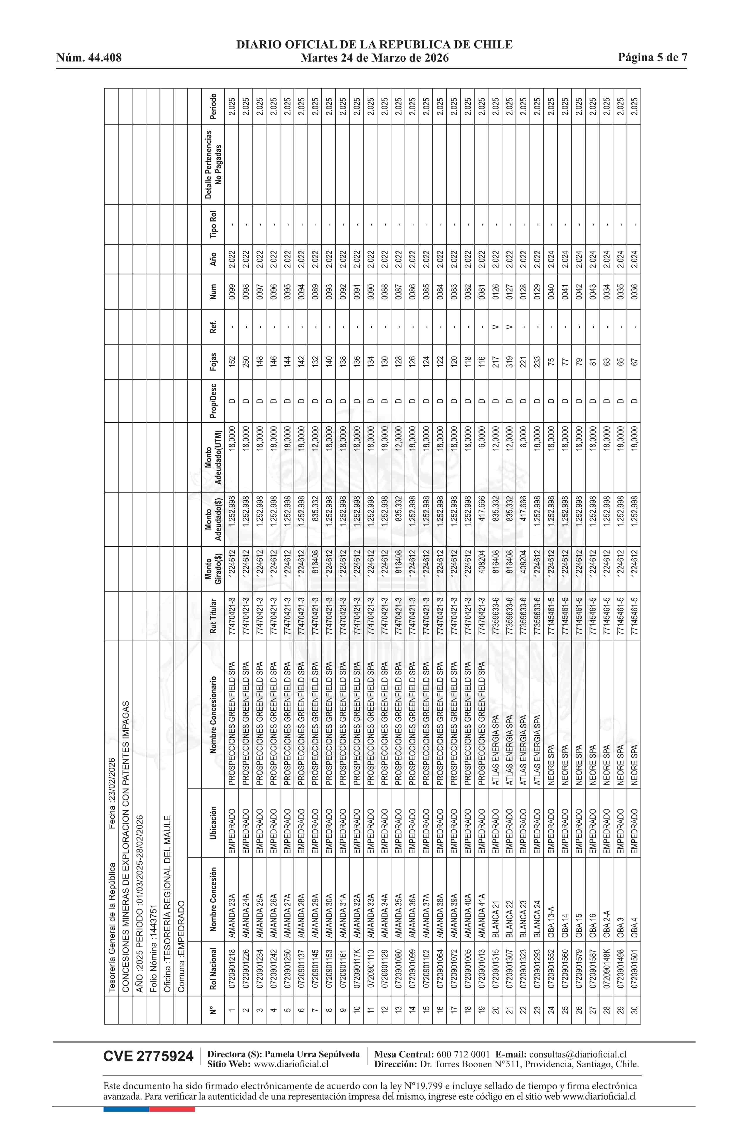 | Fuente: | DIARIO OFICIAL CHILE - BOLETÍN OFICIAL DE MINERÍA (DIARIO OFICIAL CHILE – BOM – NÓMINA REMATE) | Página(s): | 5-11 |