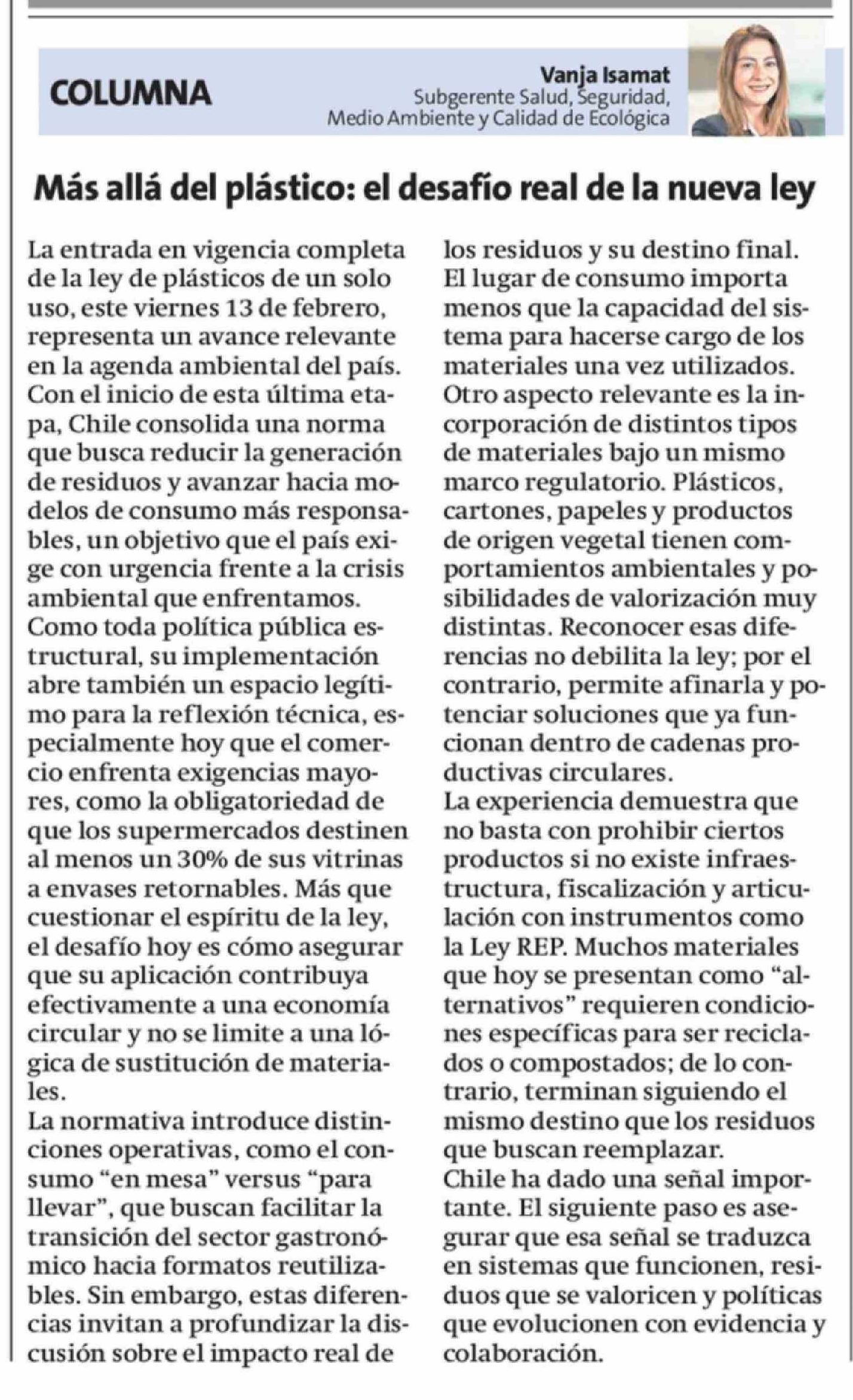 Columnas de Opinión: Más allá del plástico: el desafío real de la nueva ley 14-02-2026 La Estrella de Concepción |