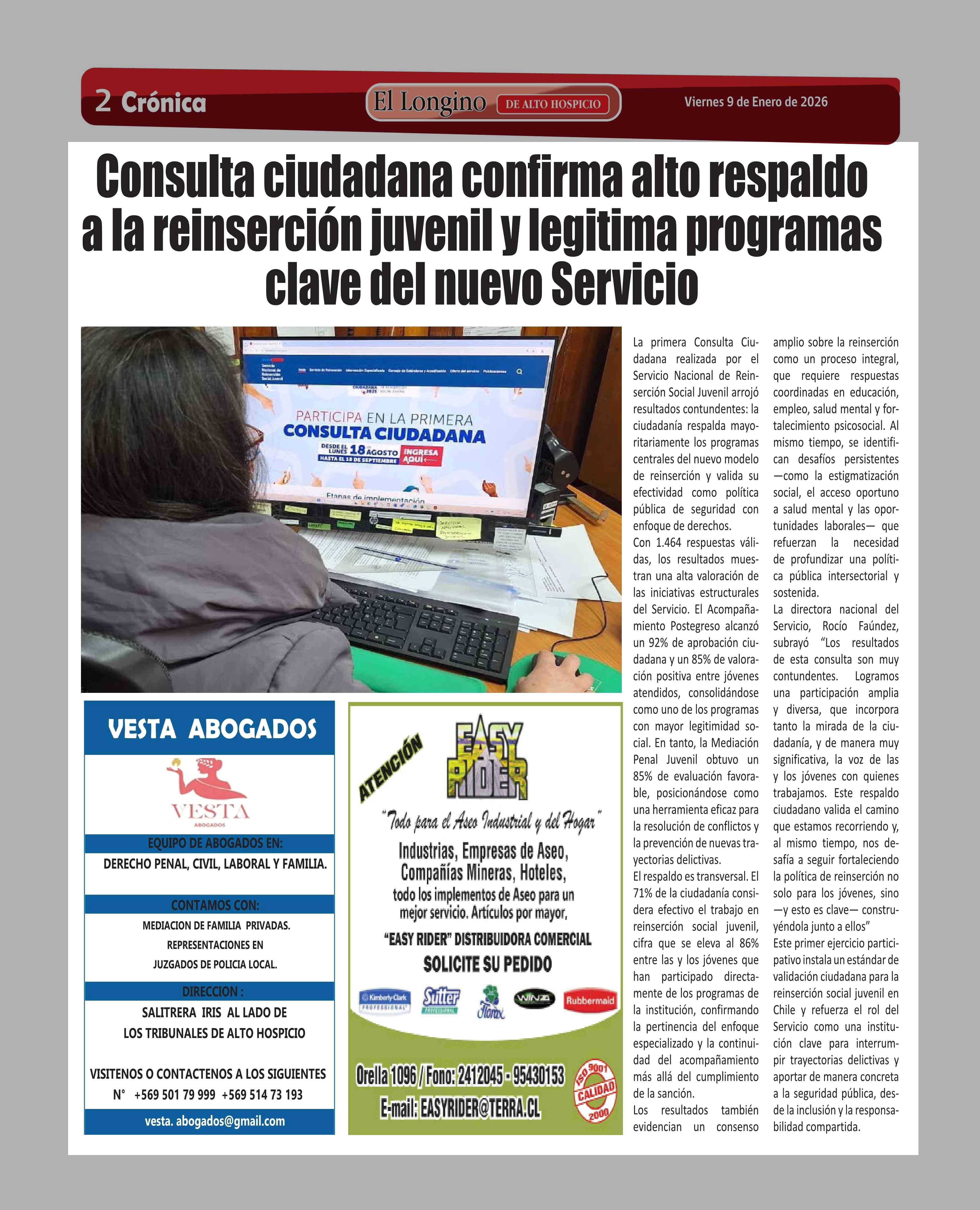Consulta ciudadana confirma alto respaldo a la reinserción juvenil y legitima programas clave del nuevo Servicio 09-01-2026 El Longino |