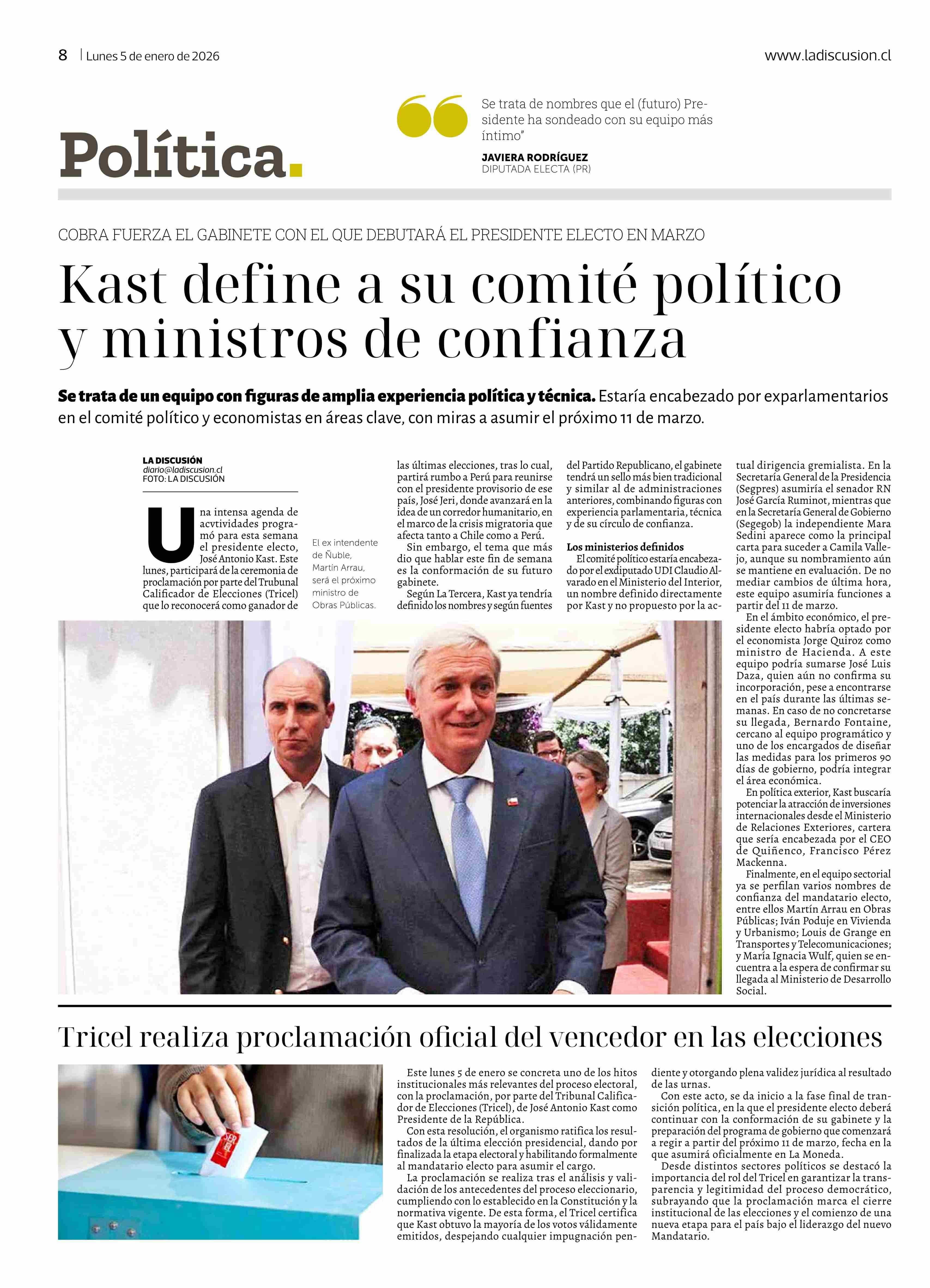 Kast define a su comité político y ministros de confianza 05-01-2026 La Discusión |