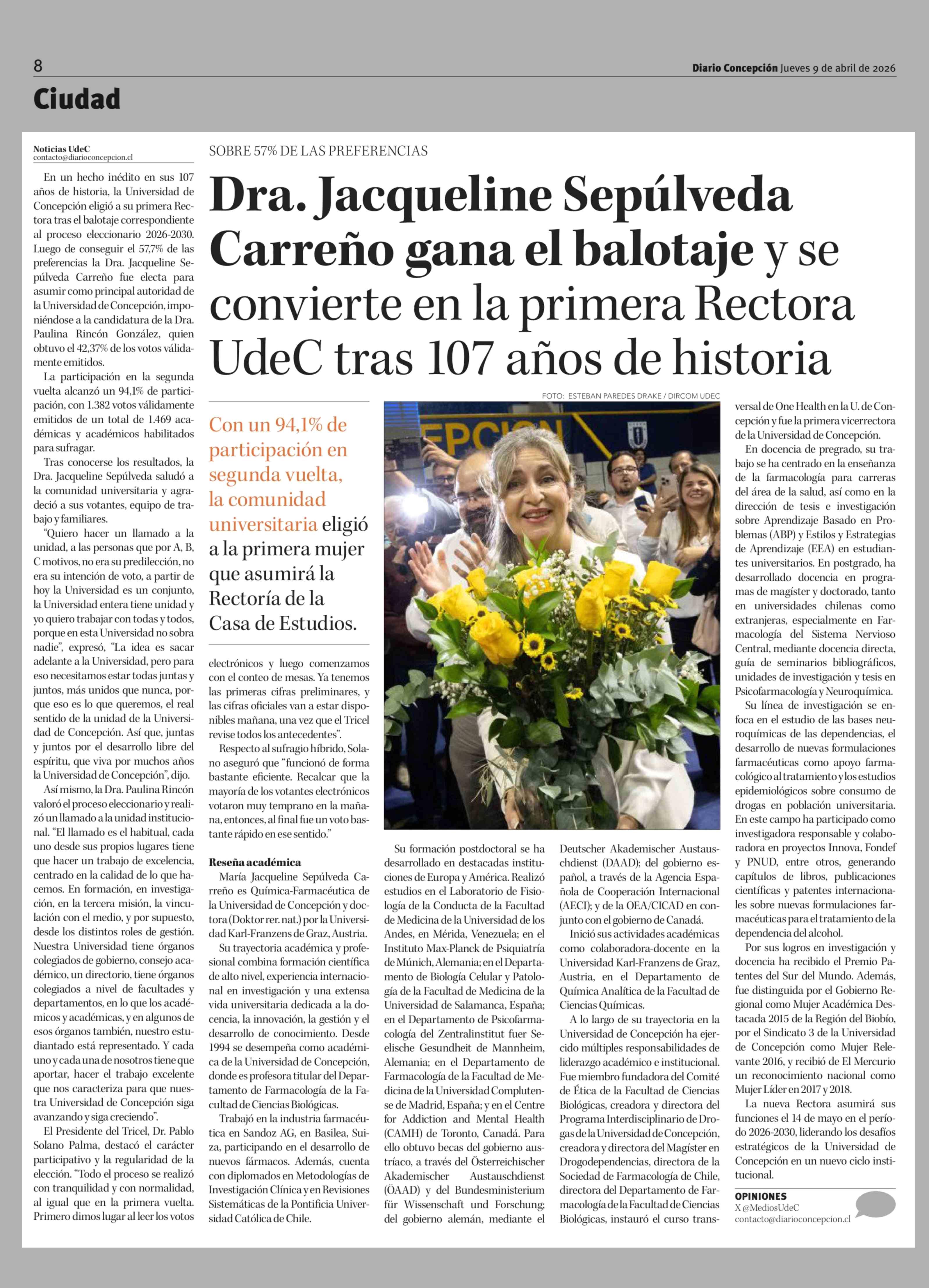 Dra. Jacqueline Sepúlveda Carreño gana el balotaje y se convierte en la primera Rectora UdeC tras 107 años de historia 09-04-2026 Diario Concepción |