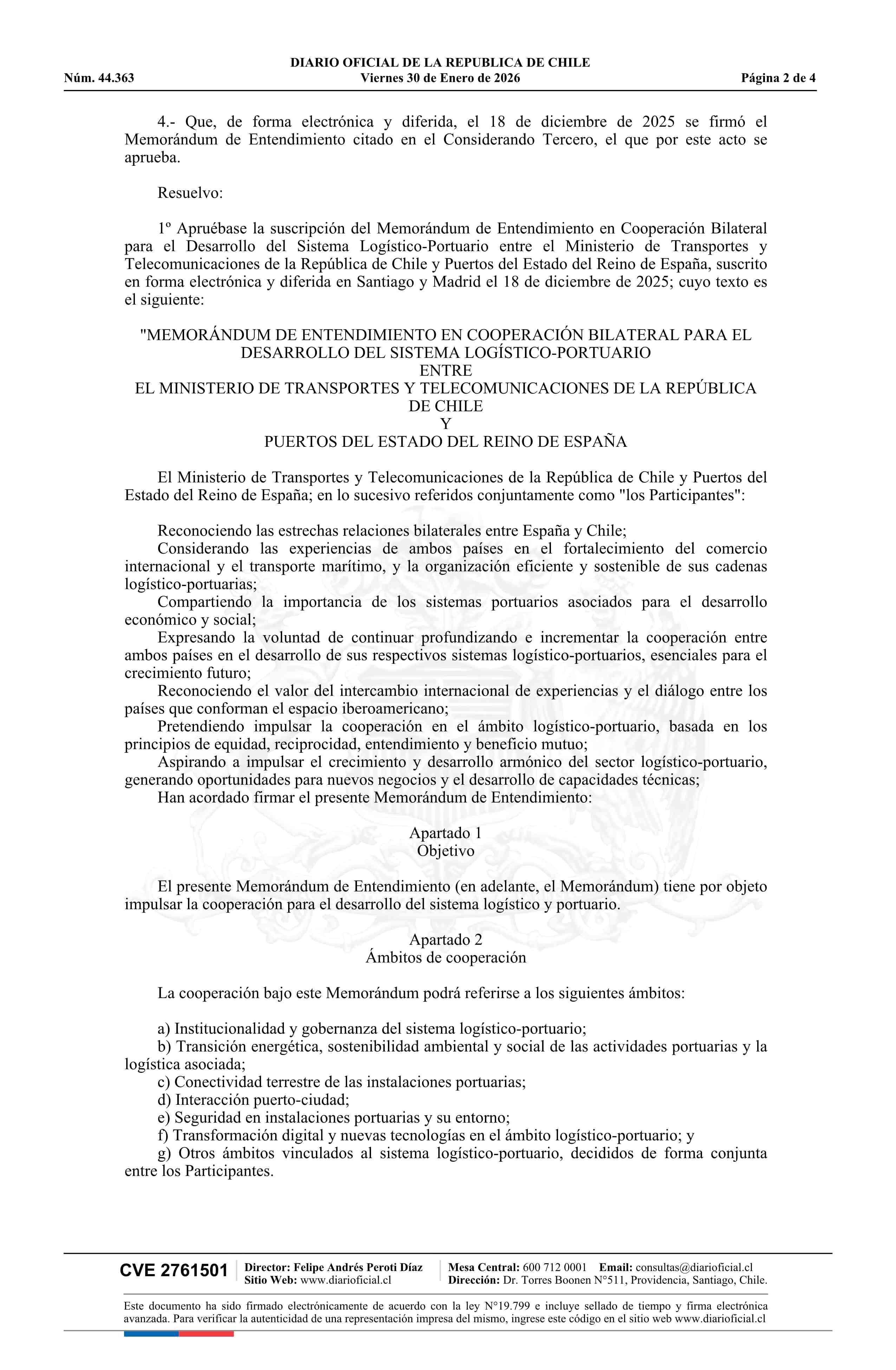 Resolución exenta número 240, de 2026.- Aprueba suscripción de Memorándum de Entendimiento en Cooperación Bilateral para el Desarrollo del Sistema Logístico-Portuario entre el Ministerio de Transportes y Telecomunicaciones de la República de Chile y Puertos del Estado del Reino de España
