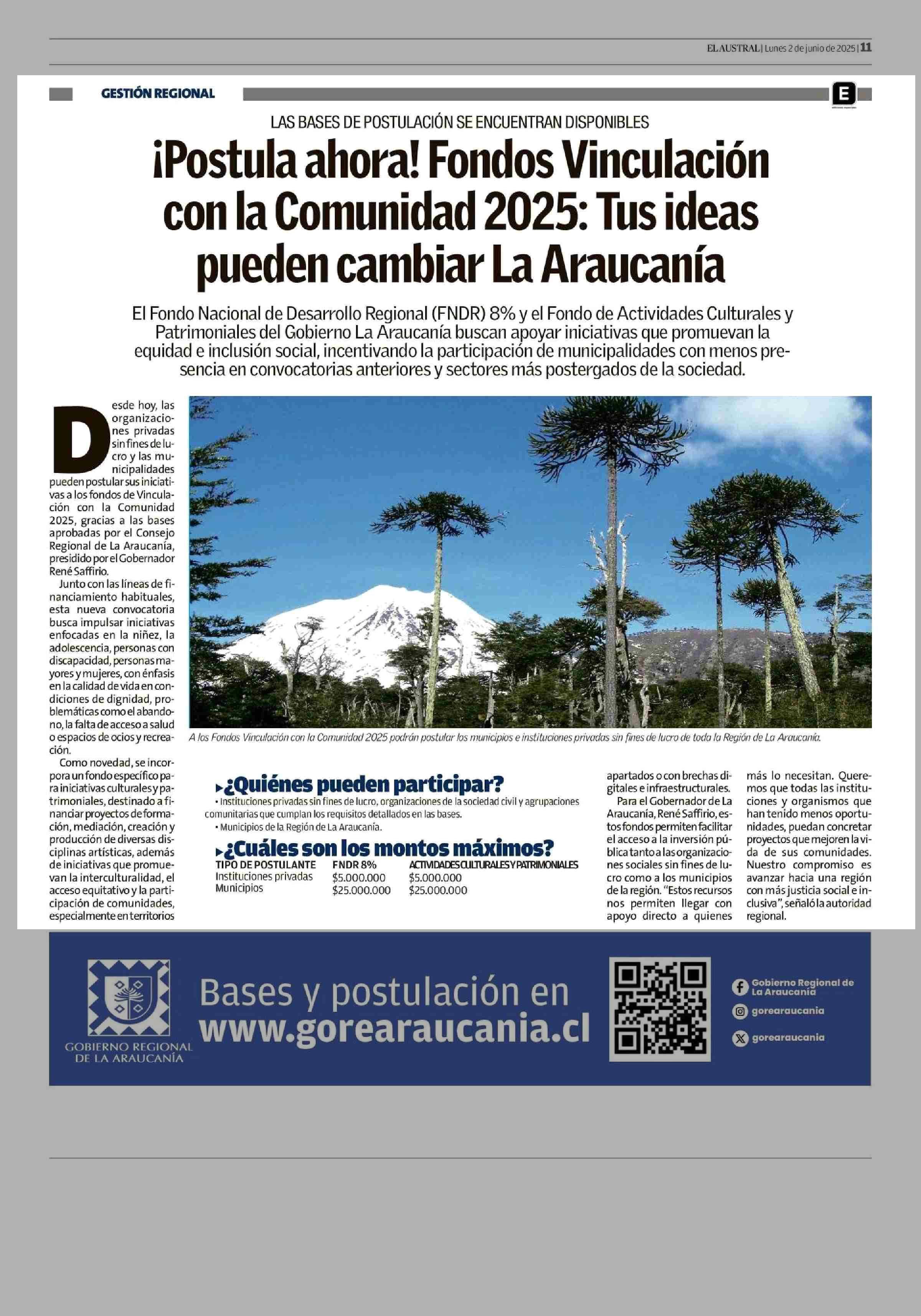 ¡Postula ahora! Fondos Vinculación con la Comunidad 2025: Tus ideas pueden cambiar La Araucanía 02-06-2025 El Austral de la Araucanía |