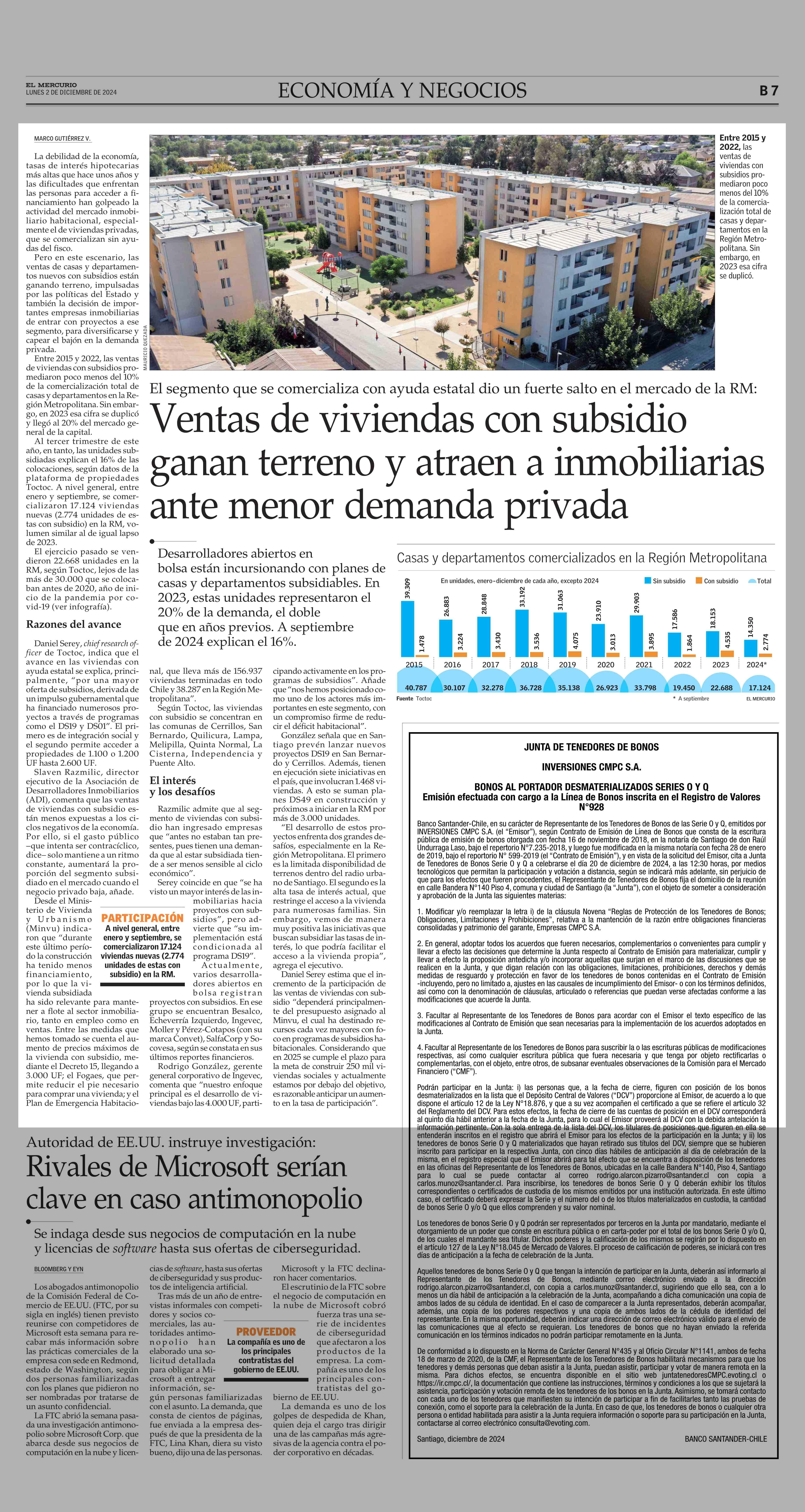Ventas de viviendas con subsidio ganan terreno y atraen a inmobiliarias ante menor demanda privada 02-12-2024 El Mercurio |