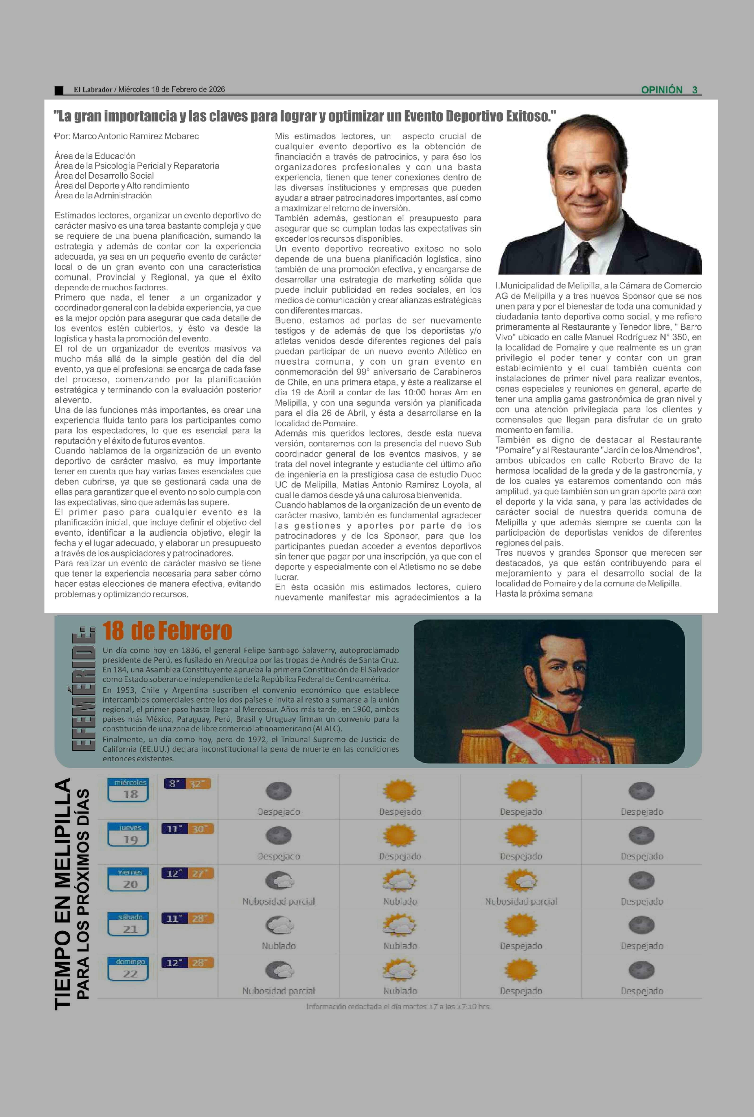 Columnas de Opinión: "La gran importancia y las claves para lograr y optimizar un Evento Deportivo Exitoso." 18-02-2026 El Labrador |