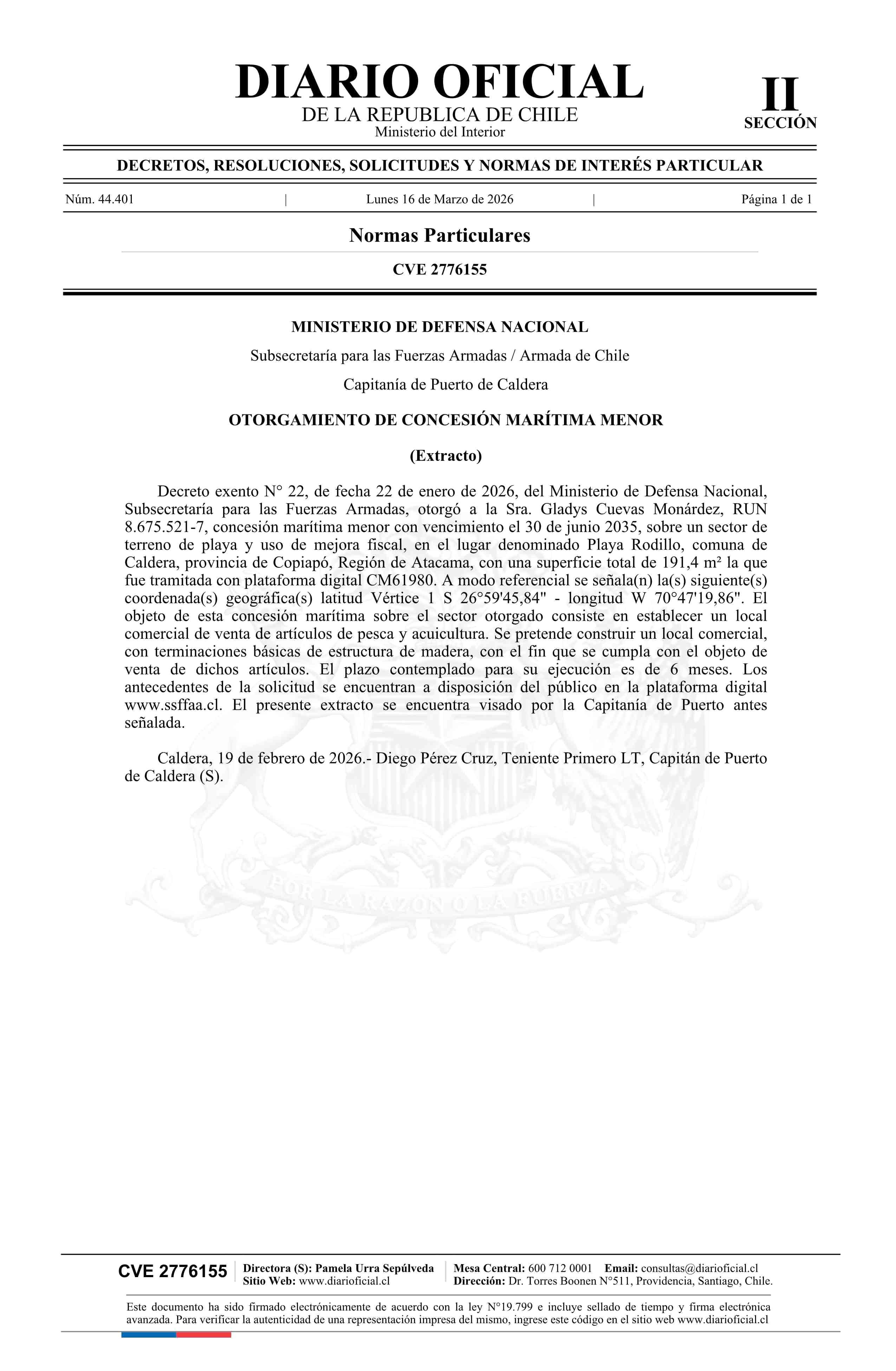 Extracto de decreto exento número 22, de 2026.- Otorgamiento de concesión marítima menor 16-03-2026 Diario Oficial Edición Electrónica |