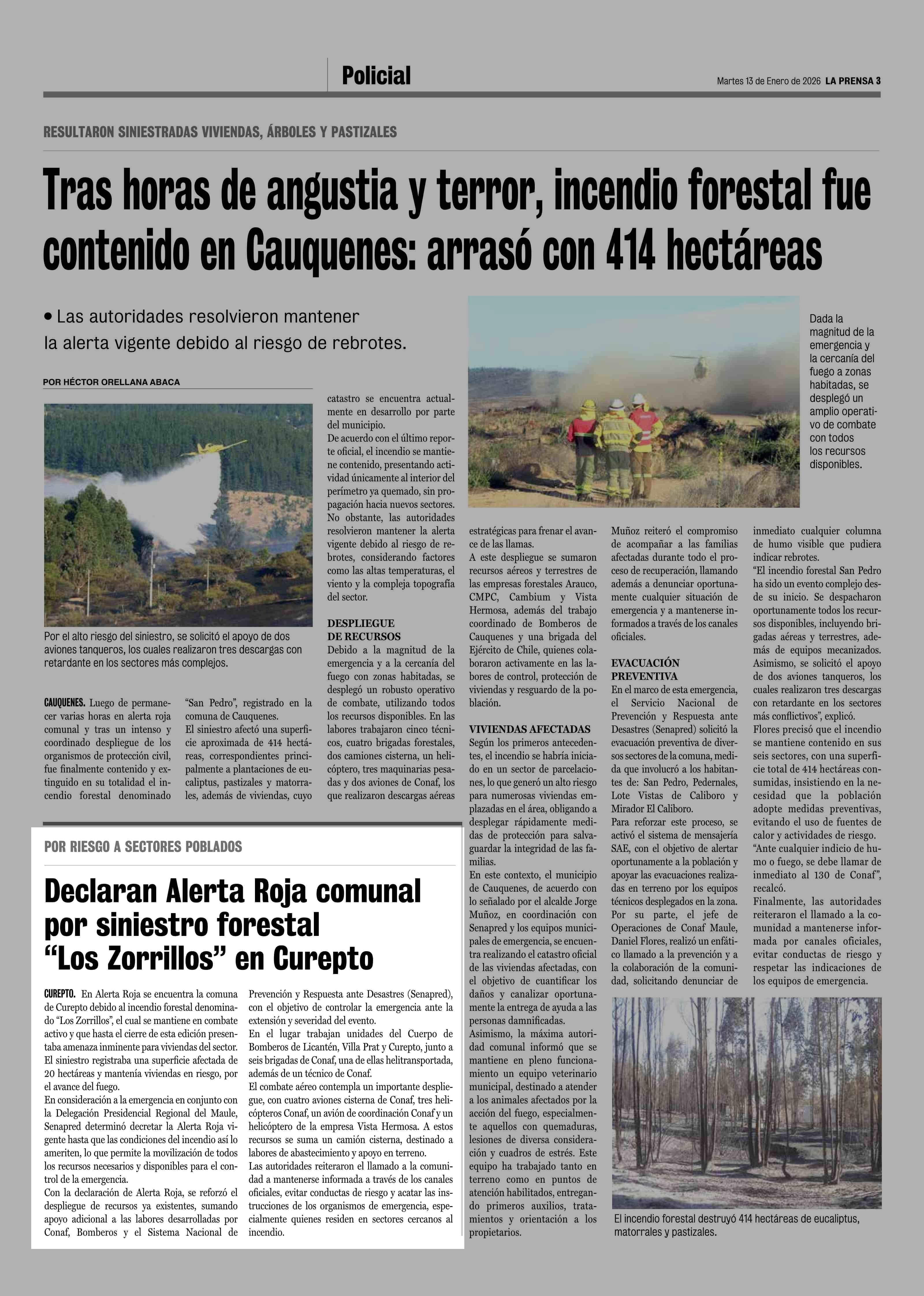 Título: Declaran Alerta Roja comunal por siniestro forestal "Los Zorrillos" en Curepto