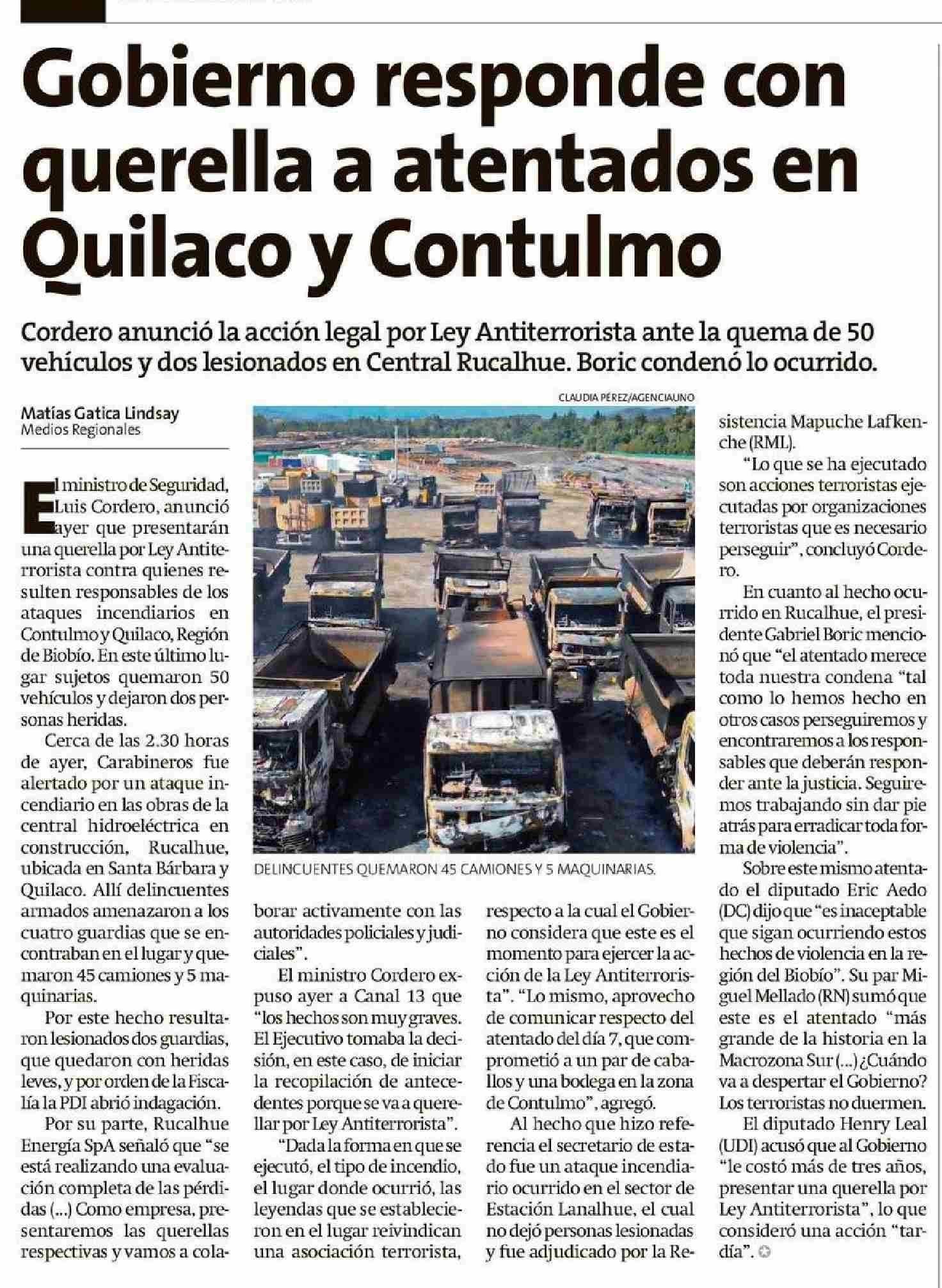 | Título: | Gobierno responde con querella a atentados en Quilaco y Contulmo |